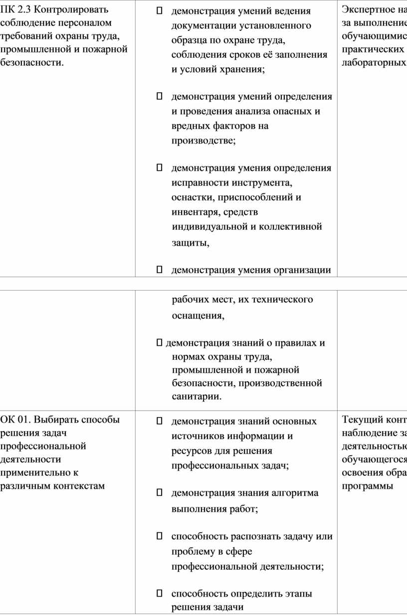 ПК 2.3 Контролировать соблюдение персоналом требований охраны труда, промышленной и пожарной безопасности. |