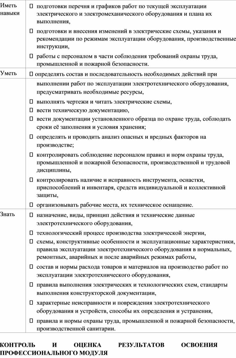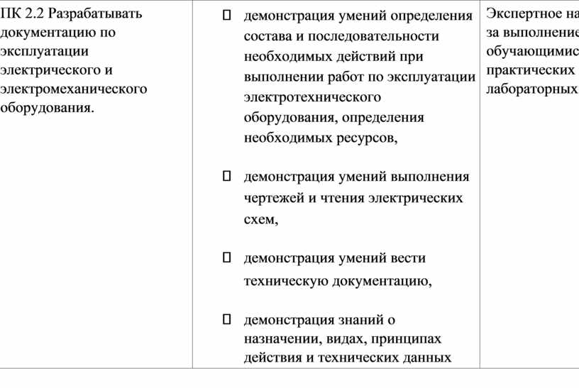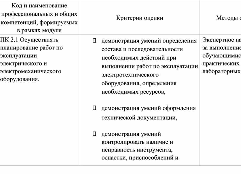 - демонстрация умений определения состава и последовательности необходимых действий при выполнении работ по эксплуатации электротехнического оборудования, определения необходимых ресурсов, - демонстрация умений оформления технической документации, - демонстрация умений контролировать наличие и исправность инструмента, оснастки, приспособлений и |