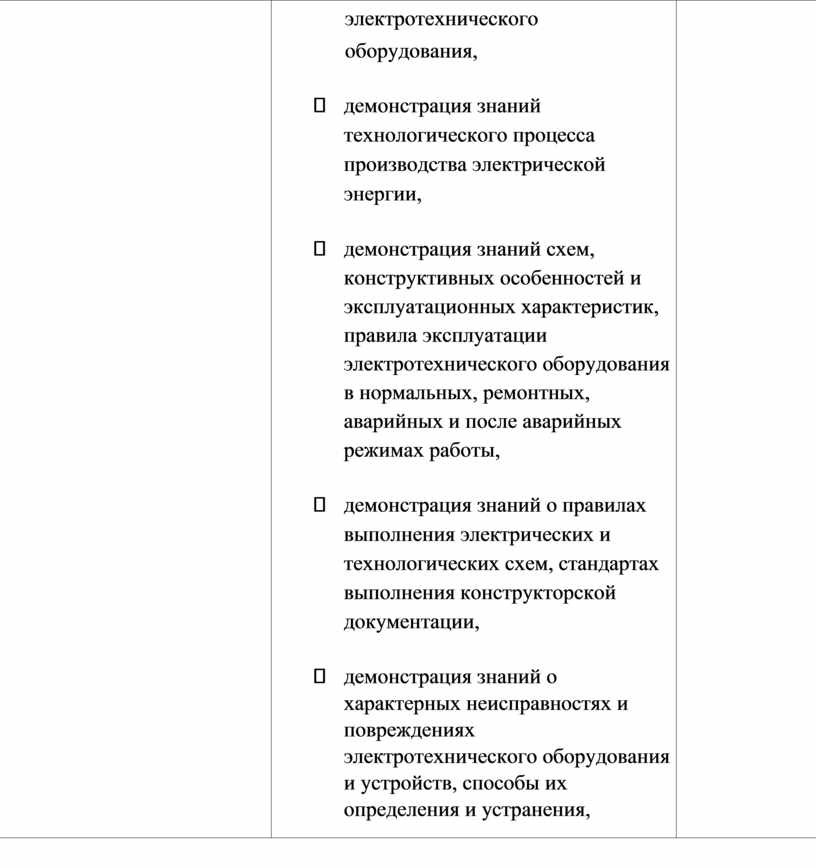 электротехнического оборудования, - демонстрация знаний технологического процесса производства электрической энергии, - демонстрация знаний схем, конструктивных особенностей и эксплуатационных характеристик, правила эксплуатации электротехнического оборудования в нормальных, ремонтных, аварийных и после аварийных режимах работы, - демонстрация знаний о правилах выполнения электрических и технологических схем, стандартах выполнения конструкторской документации, - демонстрация знаний о характерных неисправностях и повреждениях электротехнического оборудования и устройств, способы их определения и устранения, |