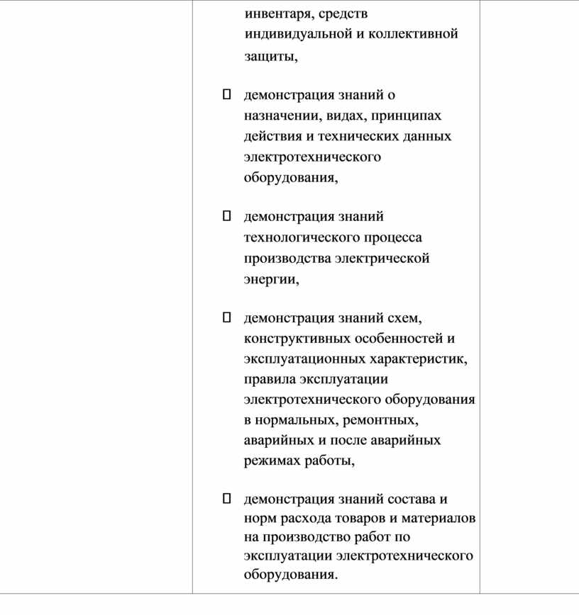 инвентаря, средств индивидуальной и коллективной защиты, - демонстрация знаний о назначении, видах, принципах действия и технических данных электротехнического оборудования, - демонстрация знаний технологического процесса производства электрической энергии, - демонстрация знаний схем, конструктивных особенностей и эксплуатационных характеристик, правила эксплуатации электротехнического оборудования в нормальных, ремонтных, аварийных и после аварийных режимах работы, - демонстрация знаний состава и норм расхода товаров и материалов на производство работ по эксплуатации электротехнического оборудования. |