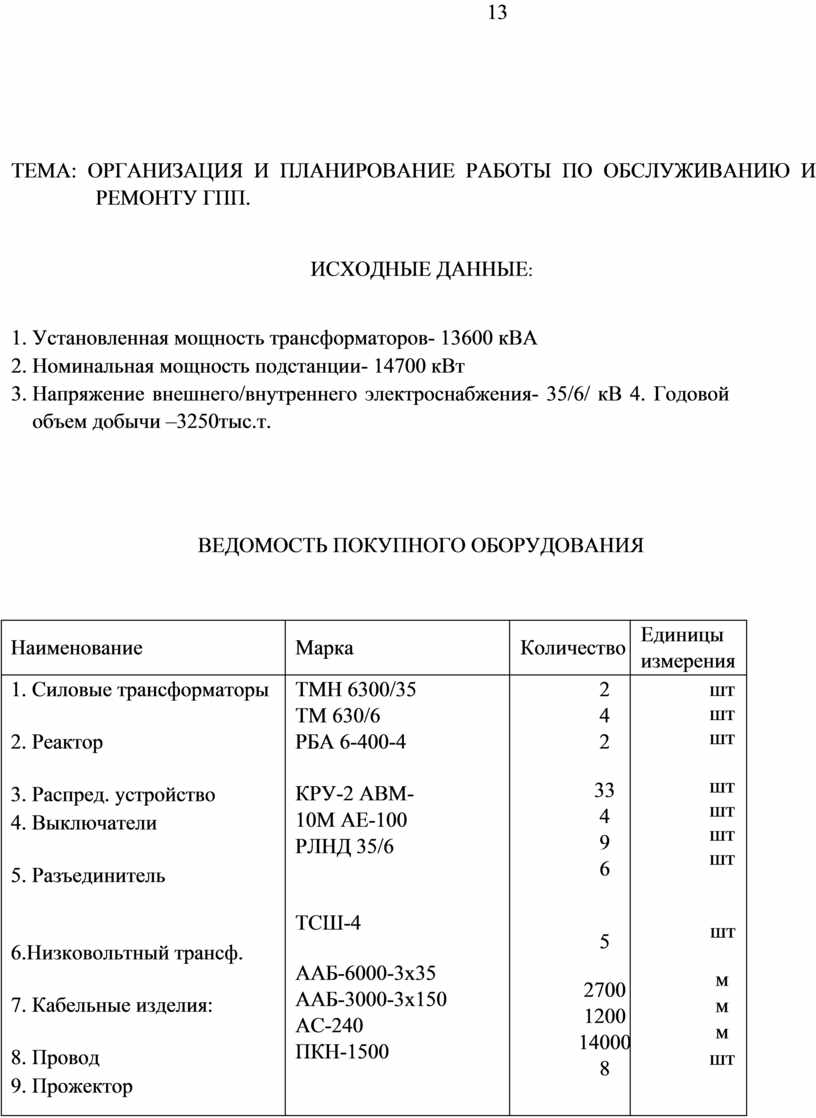 1. Силовые трансформаторы 2. Реактор 3. Распред. устройство 4. Выключатели 5. Короткозамыкатель 6. Отделитель 7. Разъединитель 8.Низковольтный трансф. 9. Кабельные изделия: 10. Провод 11. Прожектор 12. Шины |