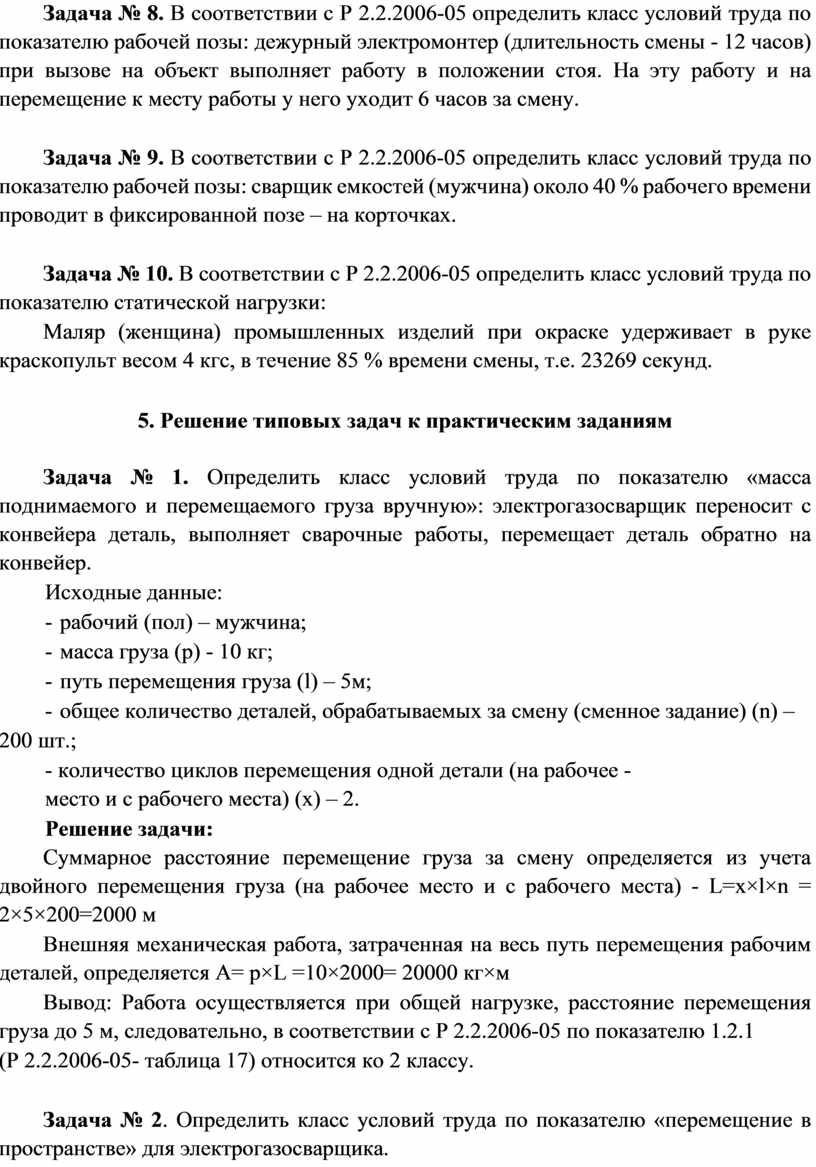 Задача № 9. В соответствии с Р 2.2.2006-05 определить класс условий труда по показателю рабочей позы: сварщик емкостей (мужчина) около 40 % рабочего времени проводит в фиксированной позе – на корточках.