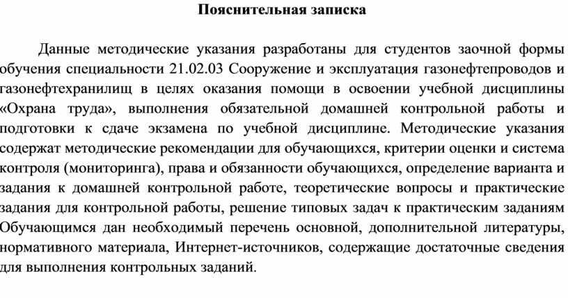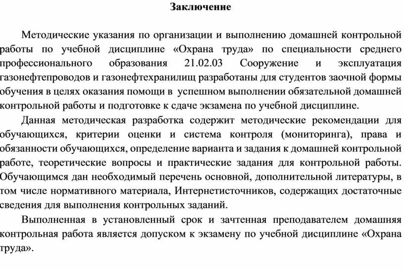 Методические указания по организации и выполнению домашней контрольной работы по учебной дисциплине «Охрана труда» по специальности среднего профессионального образования 21.02.03 Сооружение и эксплуатация газонефтепроводов и газонефтехранилищ разработаны для студентов заочной формы обучения в целях оказания помощи в успешном выполнении обязательной домашней контрольной работы и подготовке к сдаче экзамена по учебной дисциплине.