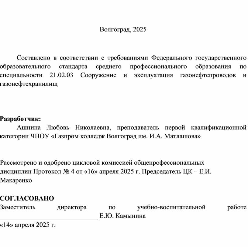 Рассмотрено и одобрено цикловой комиссией общепрофессиональных дисциплин Протокол № 4 от «16» апреля 2025 г. Председатель ЦК – Е.И. Макаренко