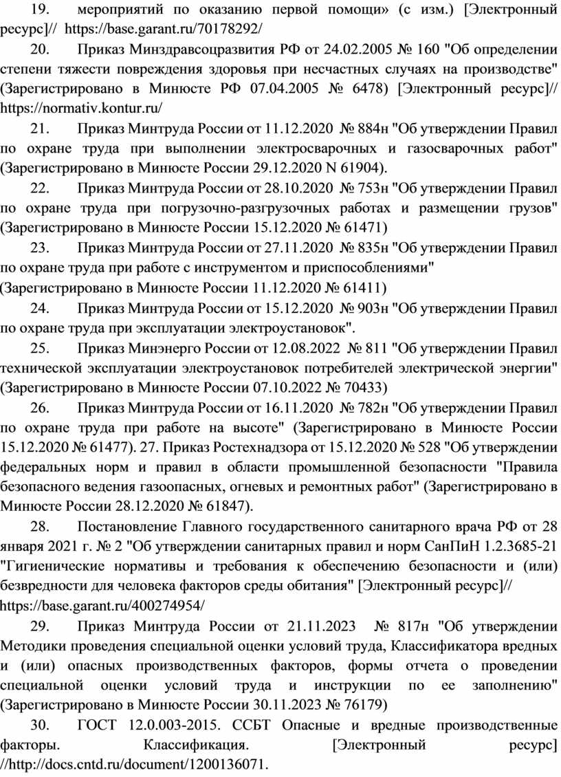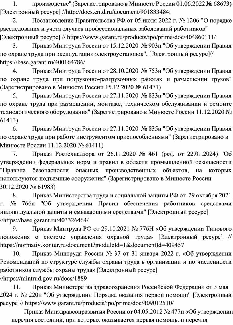 7. Постановление Правительства РФ от 24 декабря 2021 г. № 2464 "О порядке обучения по охране труда и проверки знания требований охраны труда".- Электронный ресурс]// https:// www.pravo.gov.ru