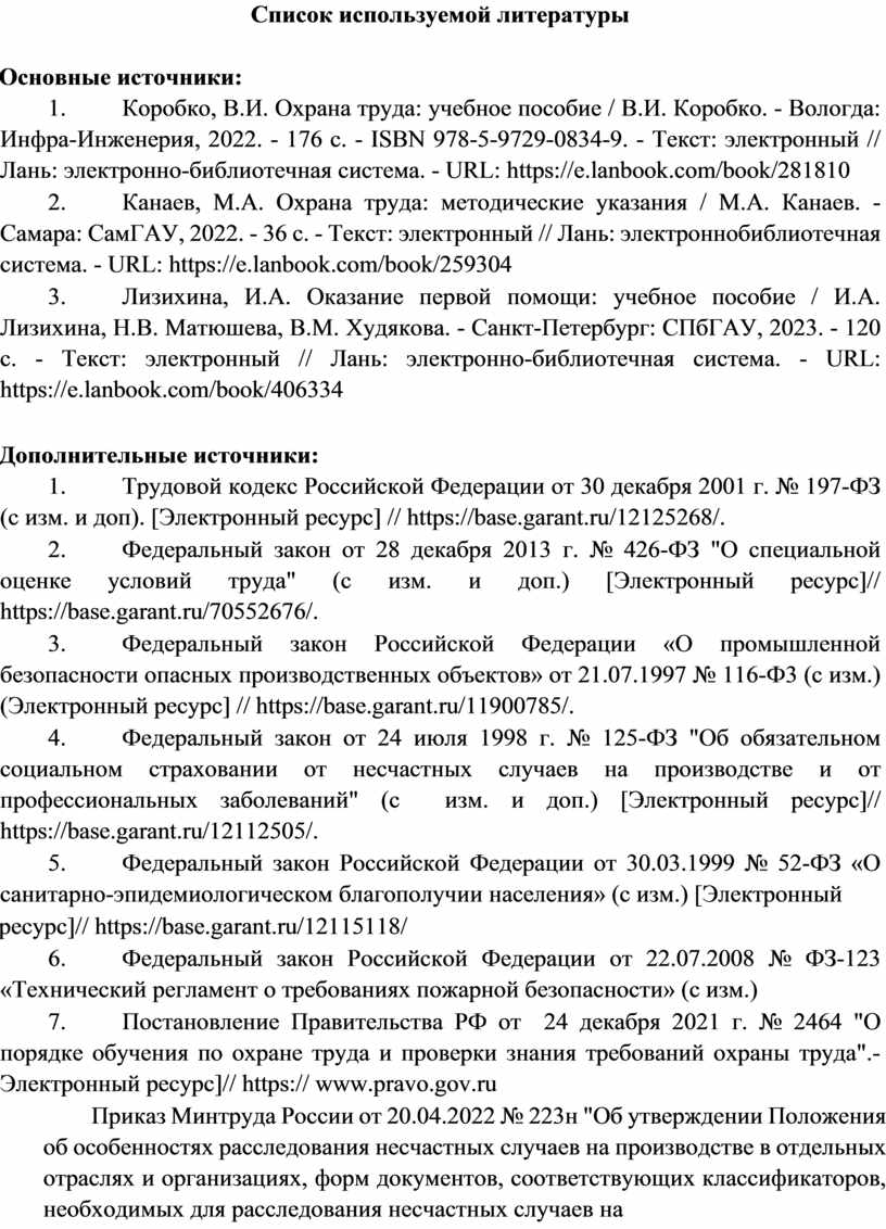 2. Канаев, М.А. Охрана труда: методические указания / М.А. Канаев. - Самара: СамГАУ, 2022. - 36 с. - Текст: электронный // Лань: электроннобиблиотечная система. - URL: https://e.lanbook.com/book/259304