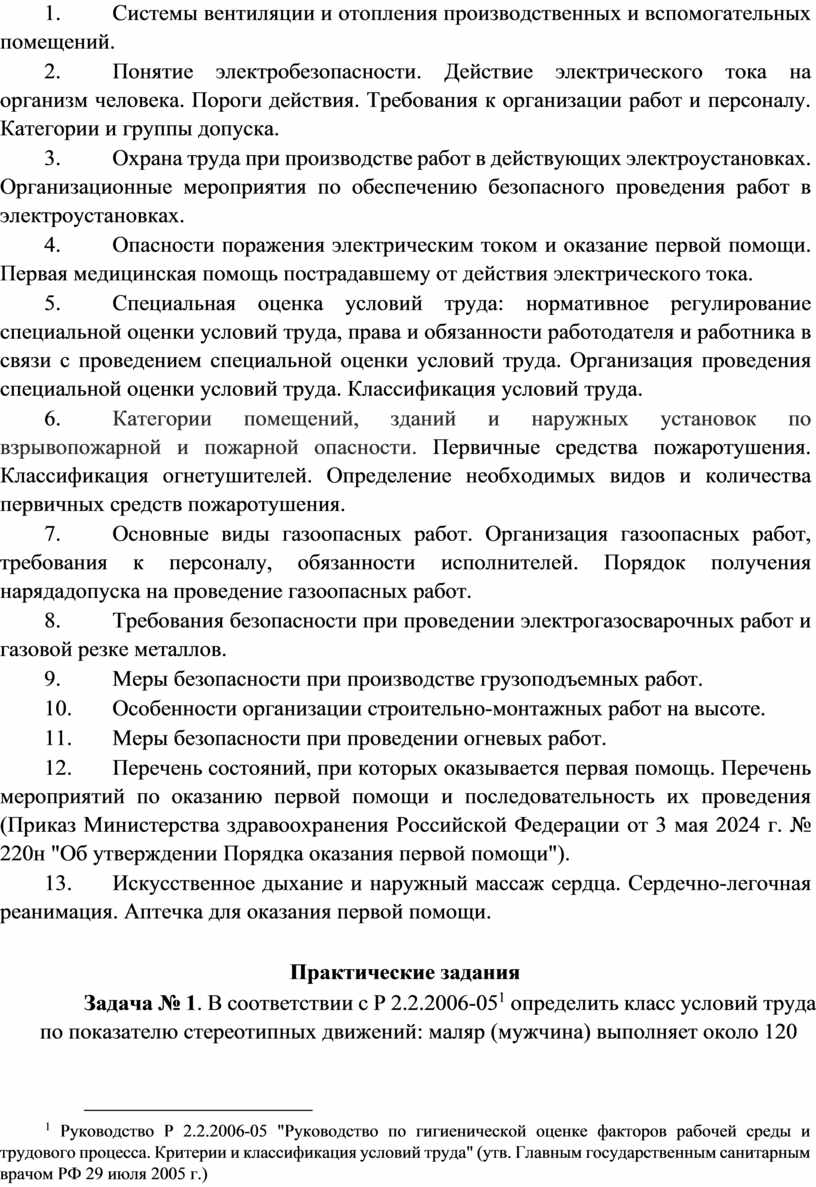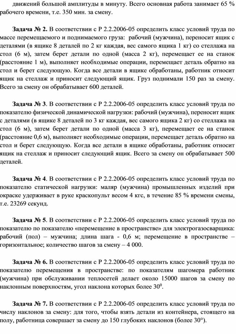 Задача № 8. В соответствии с Р 2.2.2006-05 определить класс условий труда по показателю рабочей позы: дежурный электромонтер (длительность смены - 12 часов) при вызове на объект выполняет работу в положении стоя. На эту работу и на перемещение к месту работы у него уходит 6 часов за смену.