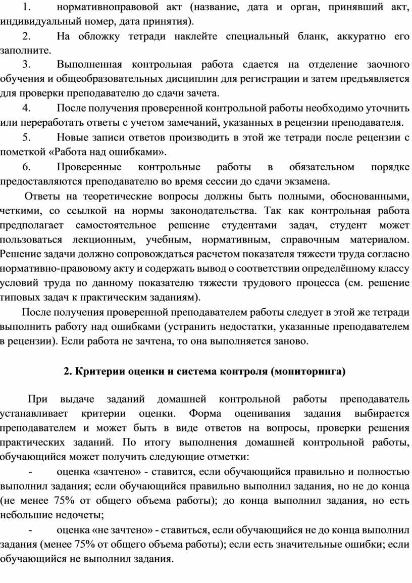 Ответы на теоретические вопросы должны быть полными, обоснованными, четкими, со ссылкой на нормы законодательства. Так как контрольная работа предполагает самостоятельное решение студентами задач, студент может пользоваться лекционным, учебным, нормативным, справочным материалом. Решение задачи должно сопровождаться расчетом показателя тяжести труда согласно нормативно-правовому акту и содержать вывод о соответствии определённому классу условий труда по данному показателю тяжести трудового процесса (см. решение типовых задач к практическим заданиям).