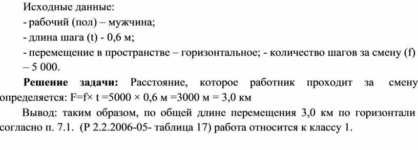 Вывод: таким образом, по общей длине перемещения 3,0 км по горизонтали согласно п. 7.1. (Р 2.2.2006-05- таблица 17) работа относится к классу 1.