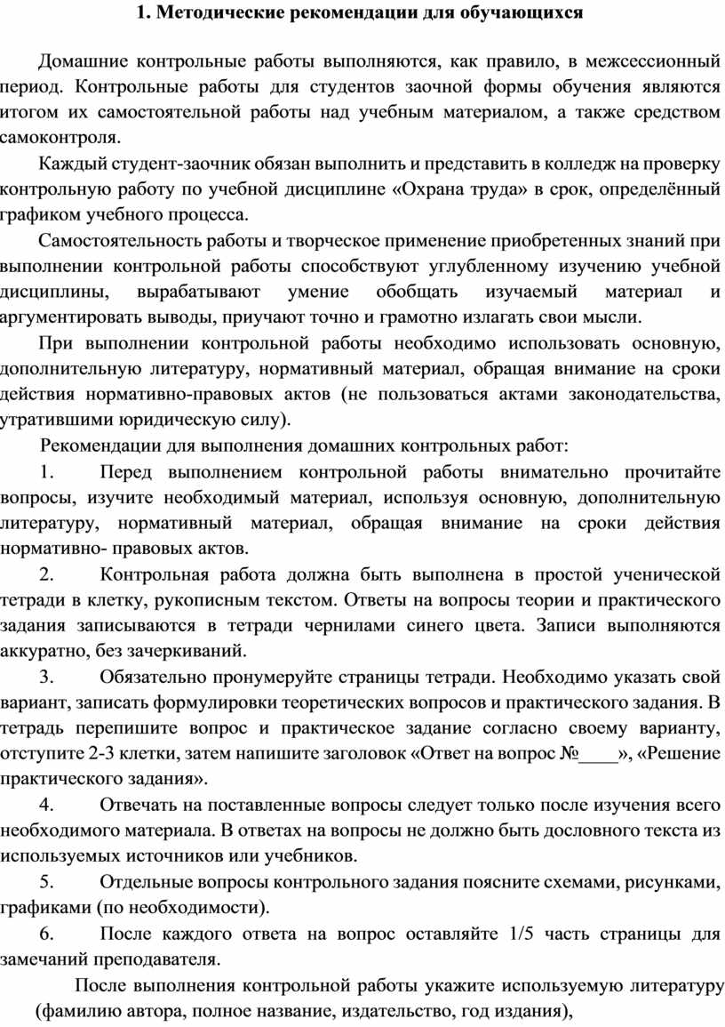 Каждый студент-заочник обязан выполнить и представить в колледж на проверку контрольную работу по учебной дисциплине «Охрана труда» в срок, определённый графиком учебного процесса.