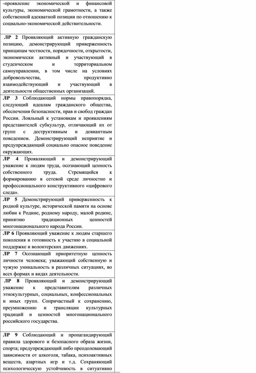 ЛР 3 Соблюдающий нормы правопорядка, следующий идеалам гражданского общества, обеспечения безопасности, прав и свобод граждан России. Лояльный к установкам и проявлениям представителей субкультур, отличающий их от групп с деструктивным и девиантным поведением. Демонстрирующий неприятие и предупреждающий социально опасное поведение окружающих. |