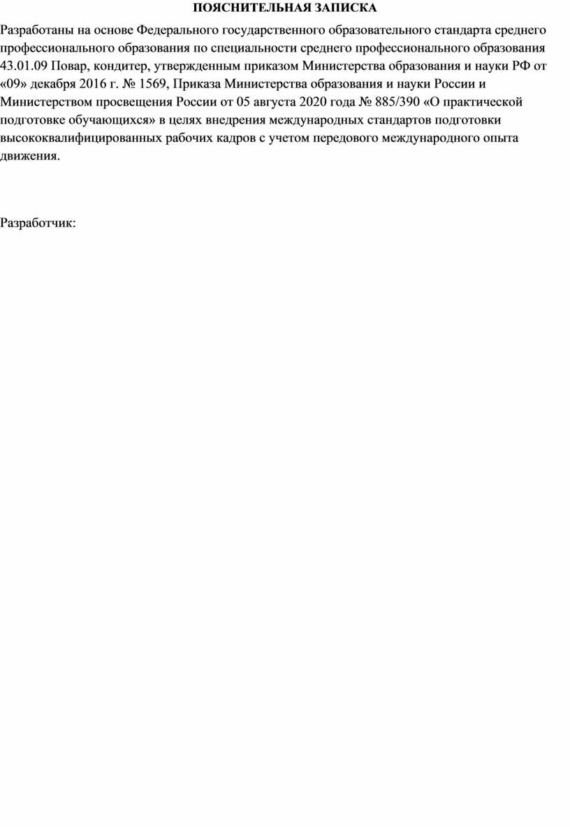 Разработаны на основе Федерального государственного образовательного стандарта среднего профессионального образования по специальности среднего профессионального образования 43.01.09 Повар, кондитер, утвержденным приказом Министерства образования и науки РФ от «09» декабря 2016 г. № 1569, Приказа Министерства образования и науки России и Министерством просвещения России от 05 августа 2020 года № 885/390 «О практической подготовке обучающихся» в целях внедрения международных стандартов подготовки высококвалифицированных рабочих кадров с учетом передового международного опыта движения.
