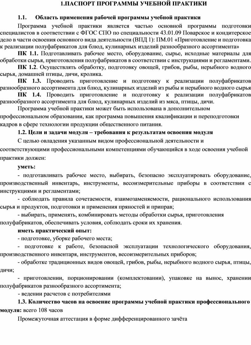 Программа учебной практики является частью основной программы подготовки специалистов в соответствии с ФГОС СПО по специальности 43.01.09 Поварское и кондитерское дело в части освоения основного вида деятельности (ВПД 1): ПМ.01 «Приготовление и подготовка к реализации полуфабрикатов для блюд, кулинарных изделий разнообразного ассортимента»
