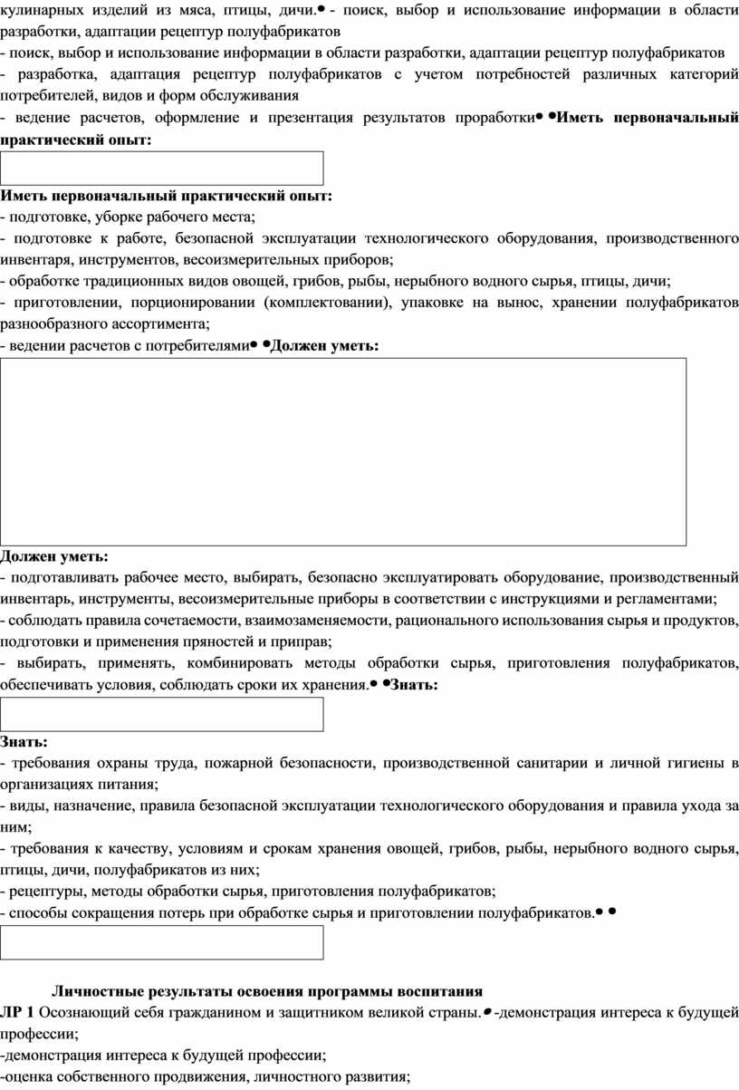 Иметь первоначальный практический опыт: - подготовке, уборке рабочего места; - подготовке к работе, безопасной эксплуатации технологического оборудования, производственного инвентаря, инструментов, весоизмерительных приборов; - обработке традиционных видов овощей, грибов, рыбы, нерыбного водного сырья, птицы, дичи; - приготовлении, порционировании (комплектовании), упаковке на вынос, хранении полуфабрикатов разнообразного ассортимента; - ведении расчетов с потребителями |