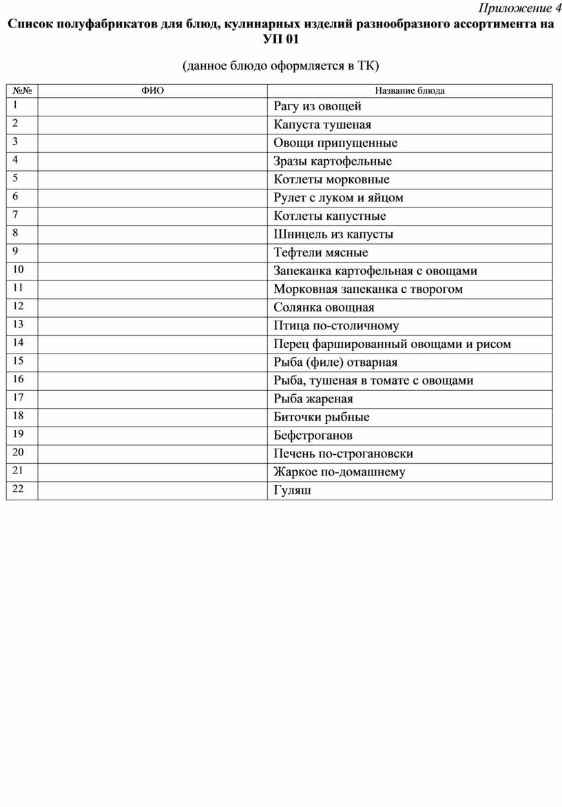 Список полуфабрикатов для блюд, кулинарных изделий разнообразного ассортимента на УП 01