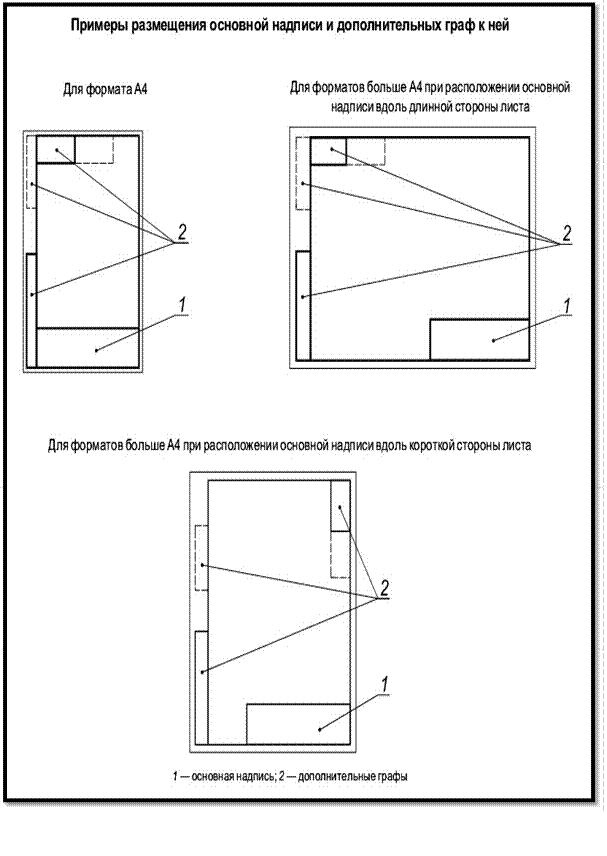 На формате А4 основная надпись должна размещаться только вдоль короткой стороны. На других форматах основная надпись может располагаться и вдоль короткой и вдоль длинной стороны формата, всегда в правом нижнем углу чертежа вплотную к рамке. Требования к сборочным чертежам