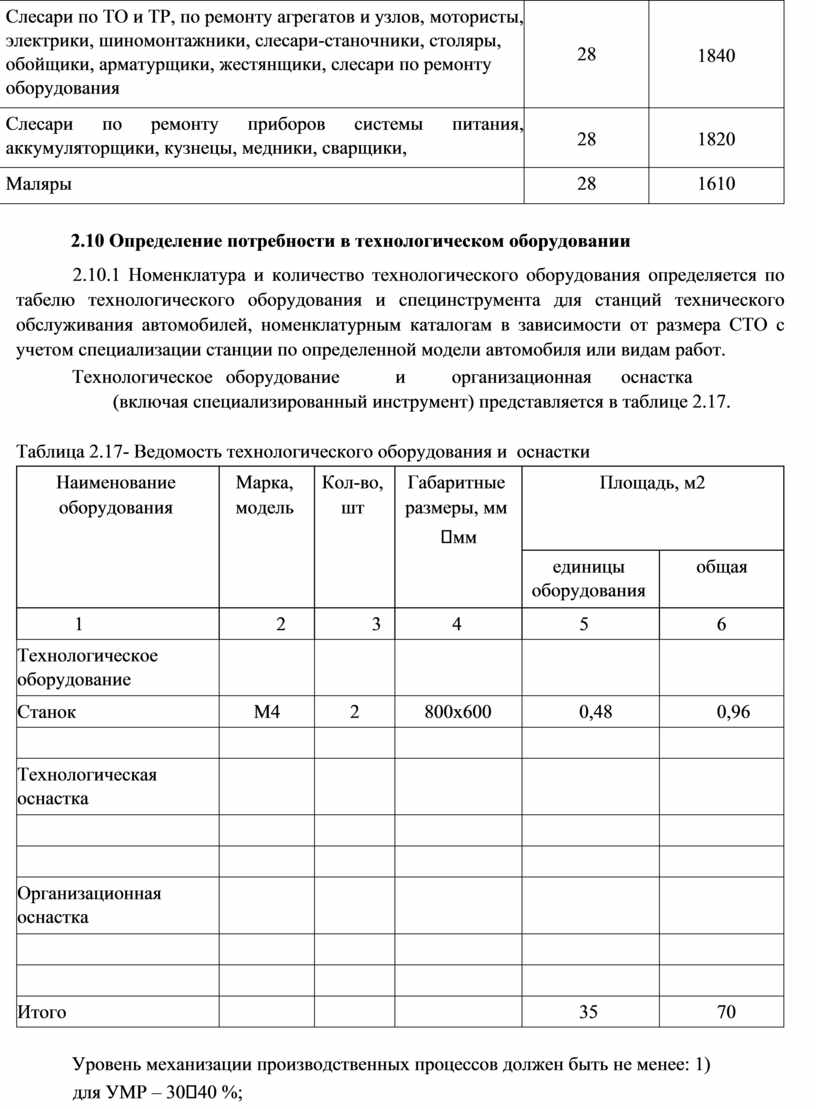 - Определение потребности в технологическом оборудовании