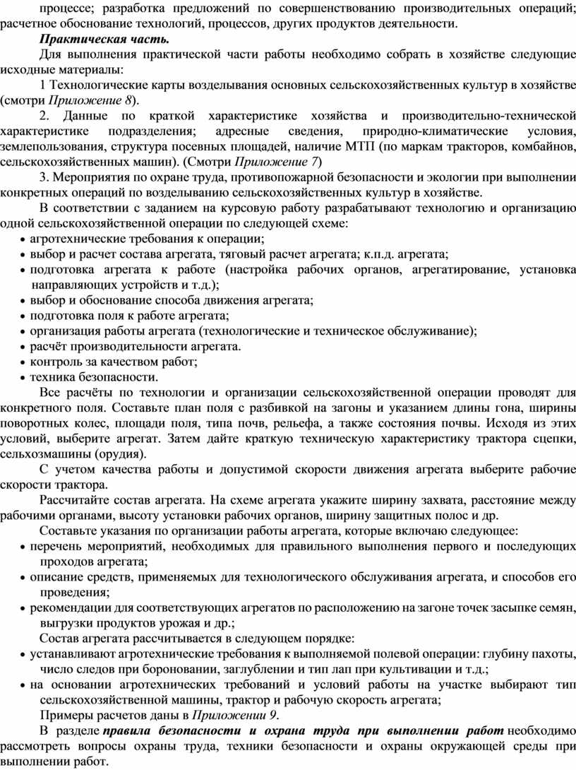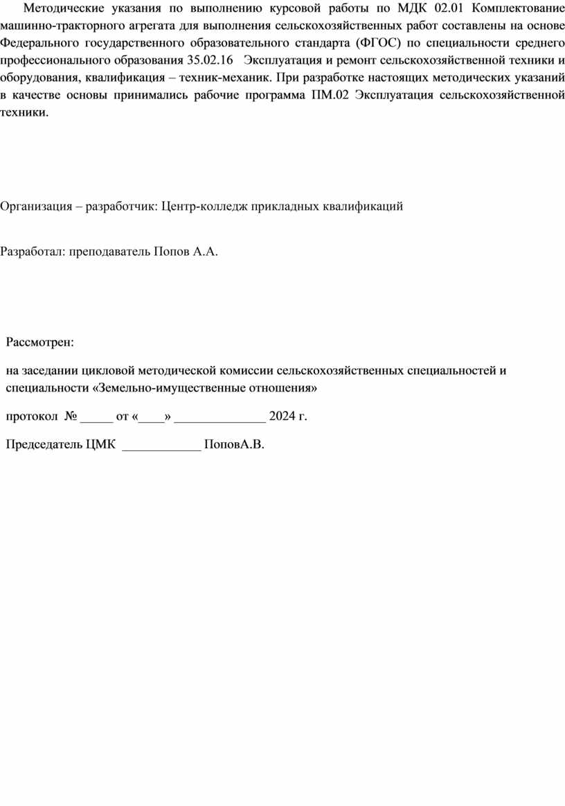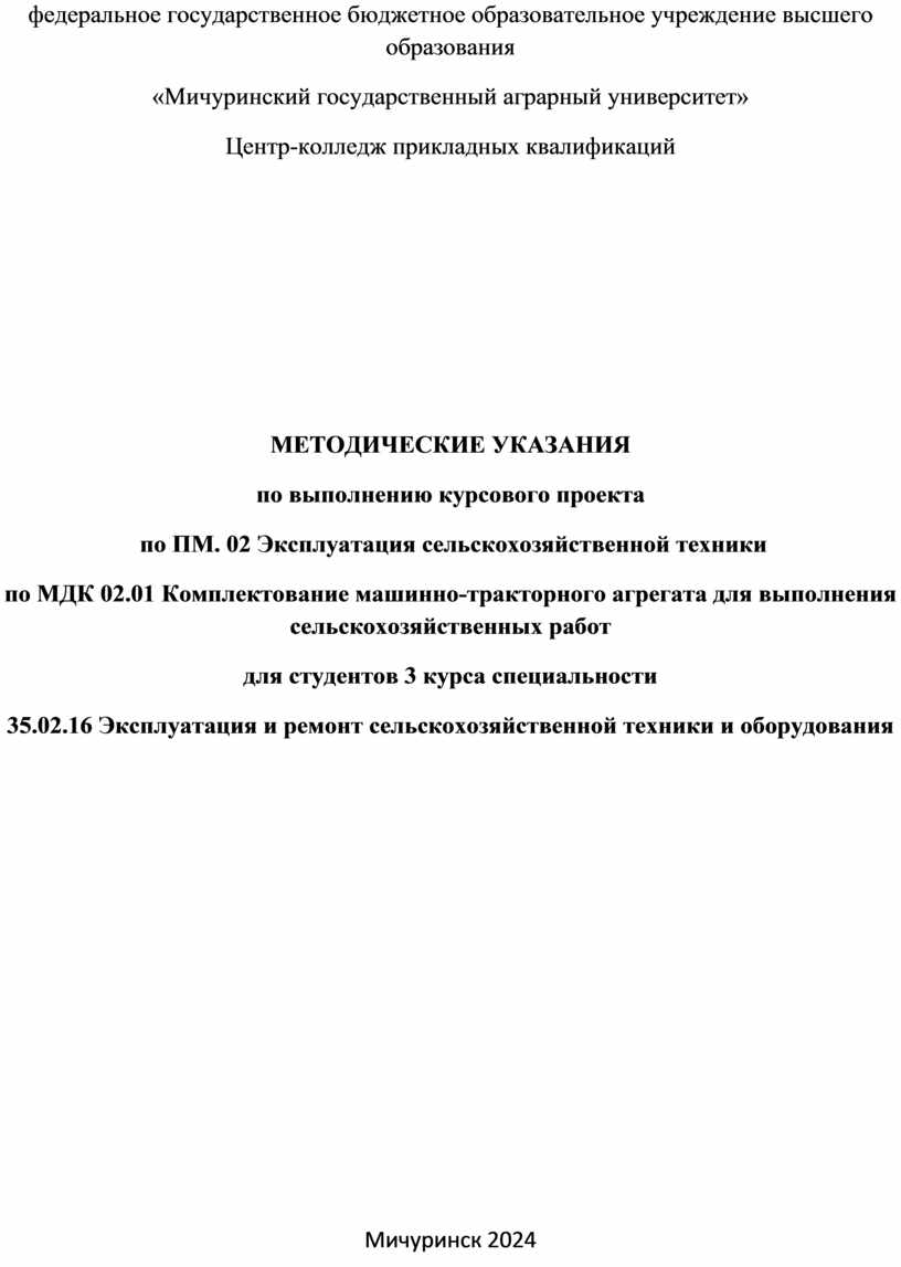 Методические указания по выполнению курсовой работы по МДК 02.01 Комплектование машинно-тракторного агрегата для выполнения сельскохозяйственных работ составлены на основе Федерального государственного образовательного стандарта (ФГОС) по специальности среднего профессионального образования 35.02.16 Эксплуатация и ремонт сельскохозяйственной техники и оборудования, квалификация – техник-механик. При разработке настоящих методических указаний в качестве основы принимались рабочие программа ПМ.02 Эксплуатация сельскохозяйственной техники.