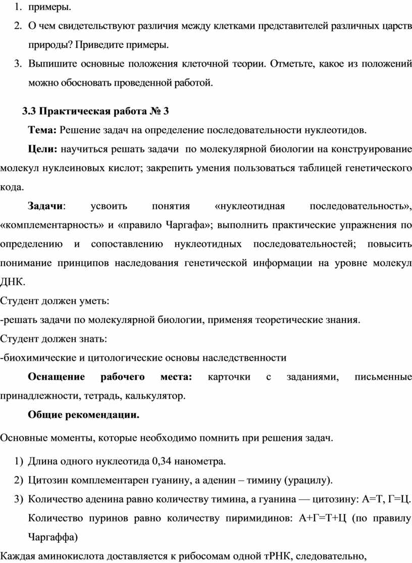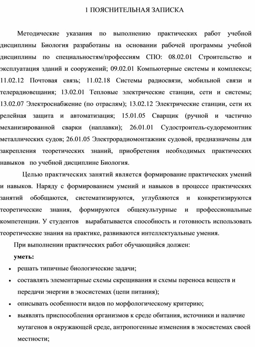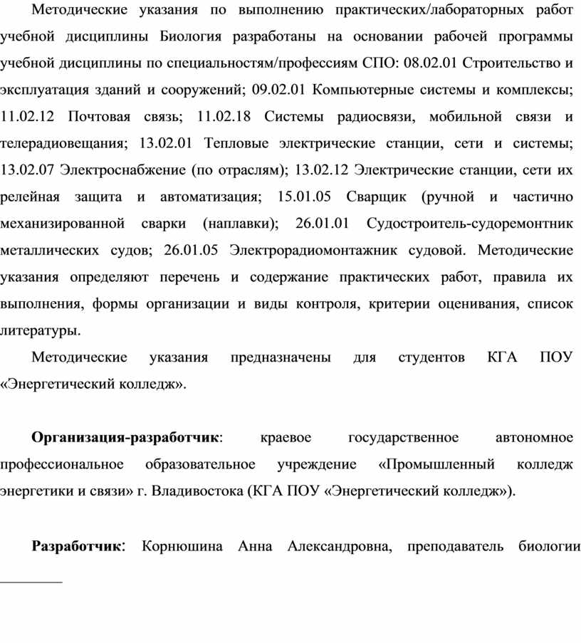 Методические указания по выполнению практических работ учебной дисциплины Биология разработаны на основании рабочей программы учебной дисциплины по специальностям/профессиям СПО: 08.02.01 Строительство и эксплуатация зданий и сооружений; 09.02.01 Компьютерные системы и комплексы; 11.02.12 Почтовая связь; 11.02.18 Системы радиосвязи, мобильной связи и телерадиовещания; 13.02.01 Тепловые электрические станции, сети и системы; 13.02.07 Электроснабжение (по отраслям); 13.02.12 Электрические станции, сети их релейная защита и автоматизация; 15.01.05 Сварщик (ручной и частично механизированной сварки (наплавки); 26.01.01 Судостроитель-судоремонтник металлических судов; 26.01.05 Электрорадиомонтажник судовой, предназначены для закрепления теоретических знаний, приобретения необходимых практических навыков по учебной дисциплине Биология.