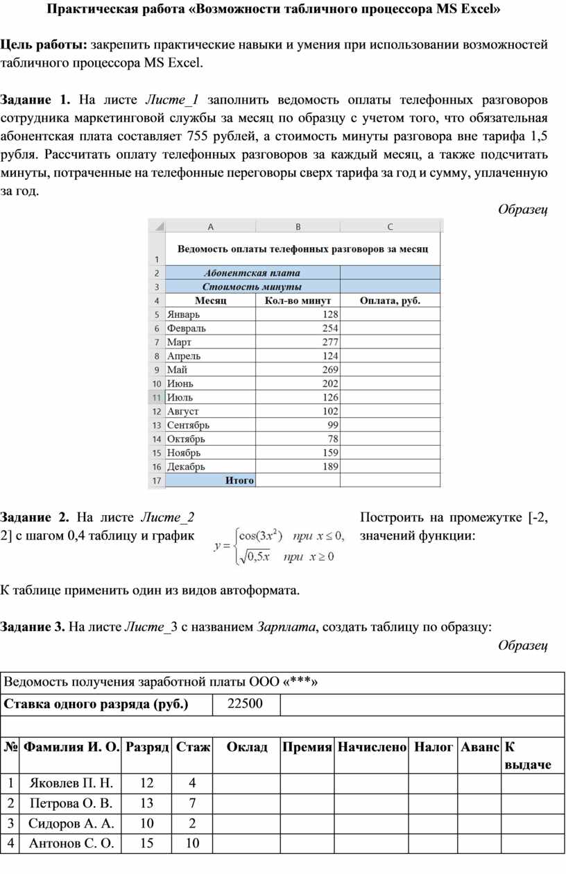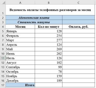 Задание 1. На листе Листе_1 заполнить ведомость оплаты телефонных разговоров сотрудника маркетинговой службы за месяц по образцу с учетом того, что обязательная абонентская плата составляет 755 рублей, а стоимость минуты разговора вне тарифа 1,5 рубля. Рассчитать оплату телефонных разговоров за каждый месяц, а также подсчитать минуты, потраченные на телефонные переговоры сверх тарифа за год и сумму, уплаченную за год.