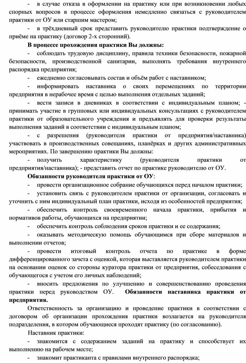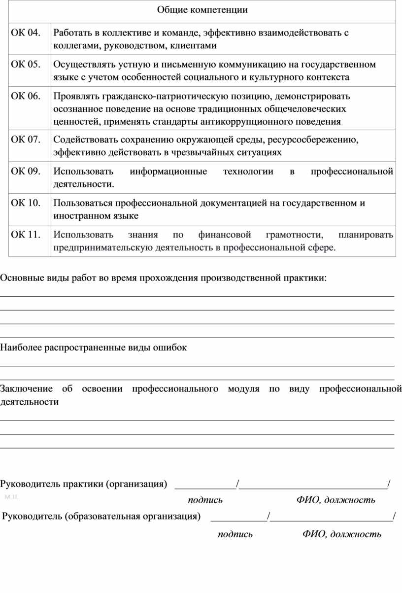 Производственная практика по профессии направлена на формирование у обучающихся умений, приобретение первоначального практического опыта и реализуется в рамках профессиональных модулей ОПОП СПО по основным видам профессиональной деятельности для последующего освоения ими общих и профессиональных компетенций по избранной специальности.