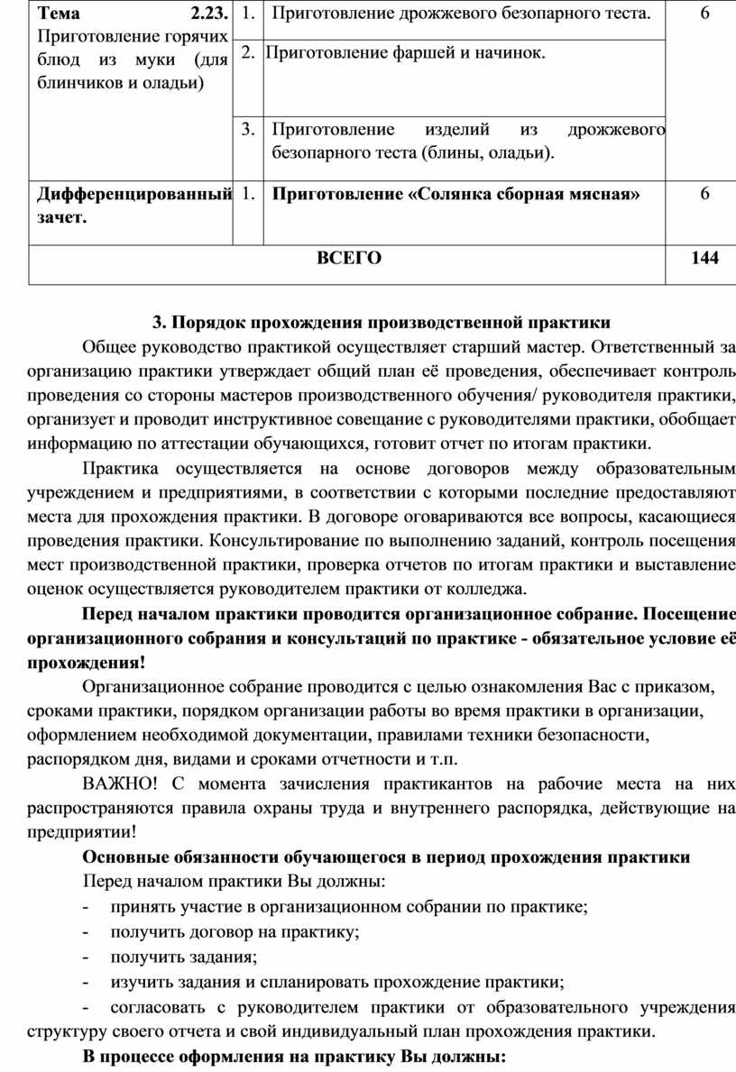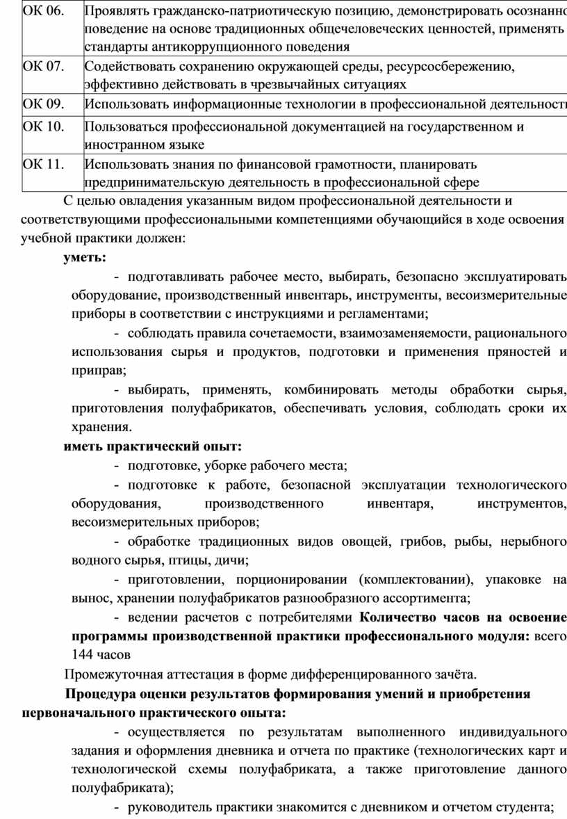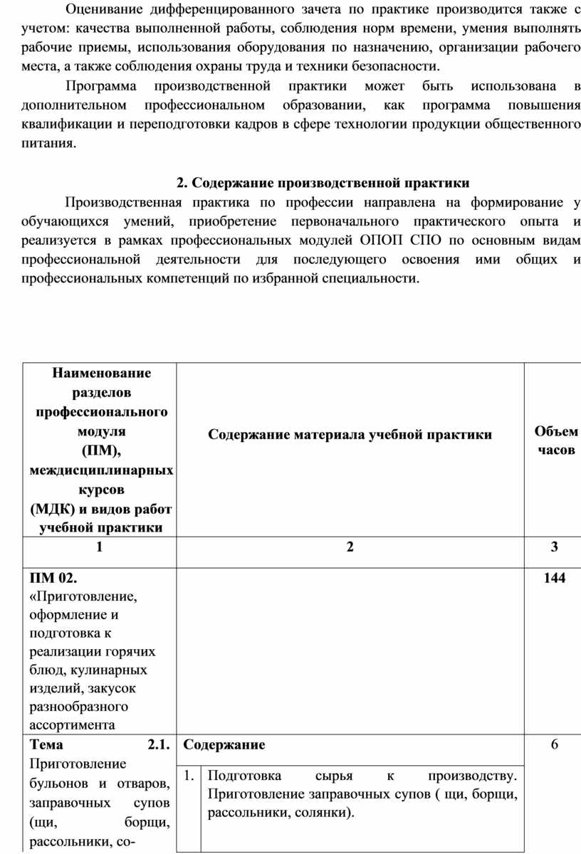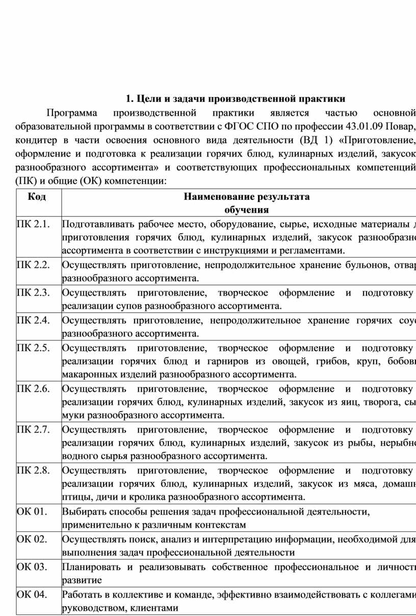 Программа производственной практики является частью основной образовательной программы в соответствии с ФГОС СПО по профессии 43.01.09 Повар, кондитер в части освоения основного вида деятельности (ВД 1) «Приготовление, оформление и подготовка к реализации горячих блюд, кулинарных изделий, закусок разнообразного ассортимента» и соответствующих профессиональных компетенций (ПК) и общие (ОК) компетенции: