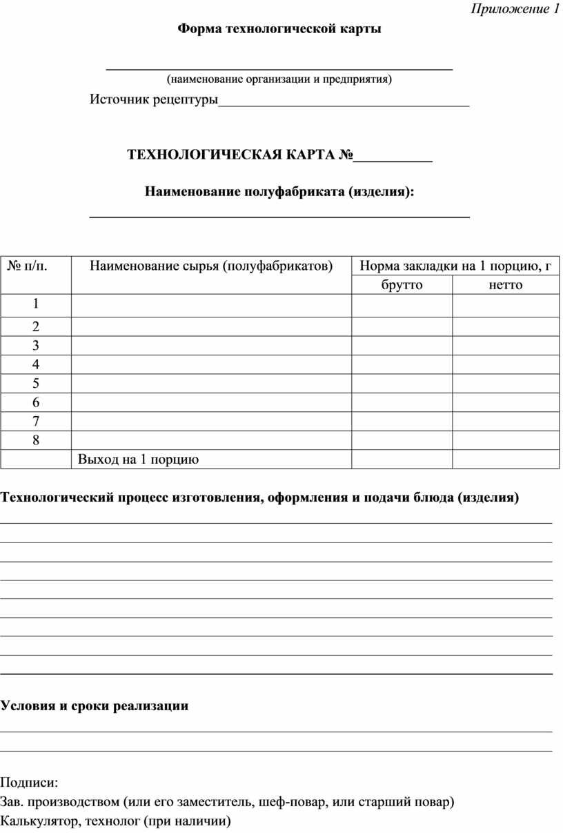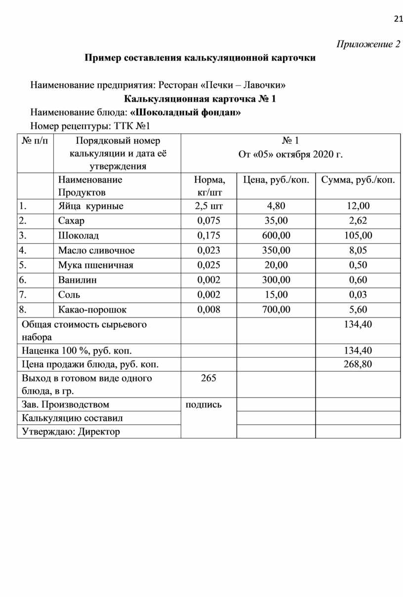 Приложение 2. Калькуляционная карта Приложение 3. Титульный лист отчета.