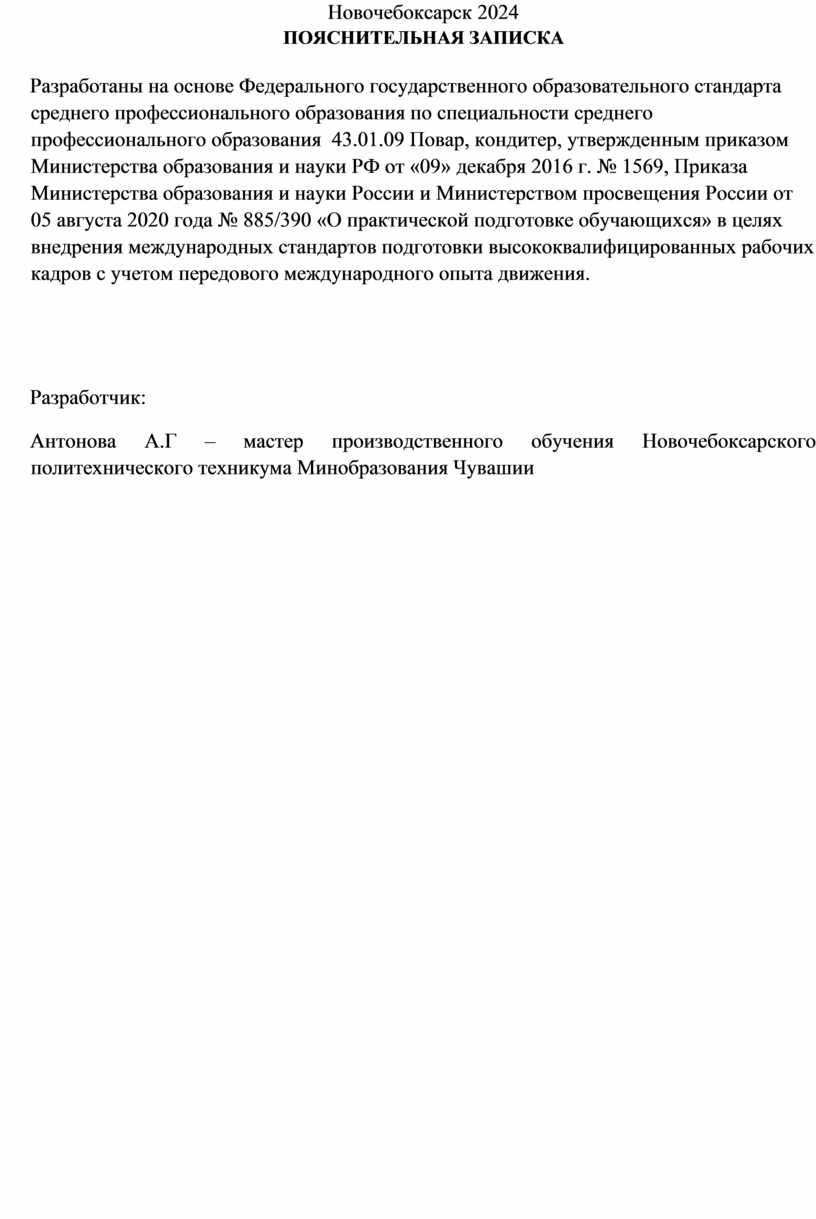 Разработаны на основе Федерального государственного образовательного стандарта среднего профессионального образования по специальности среднего профессионального образования 43.01.09 Повар, кондитер, утвержденным приказом Министерства образования и науки РФ от «09» декабря 2016 г. № 1569, Приказа Министерства образования и науки России и Министерством просвещения России от 05 августа 2020 года № 885/390 «О практической подготовке обучающихся» в целях внедрения международных стандартов подготовки высококвалифицированных рабочих кадров с учетом передового международного опыта движения.