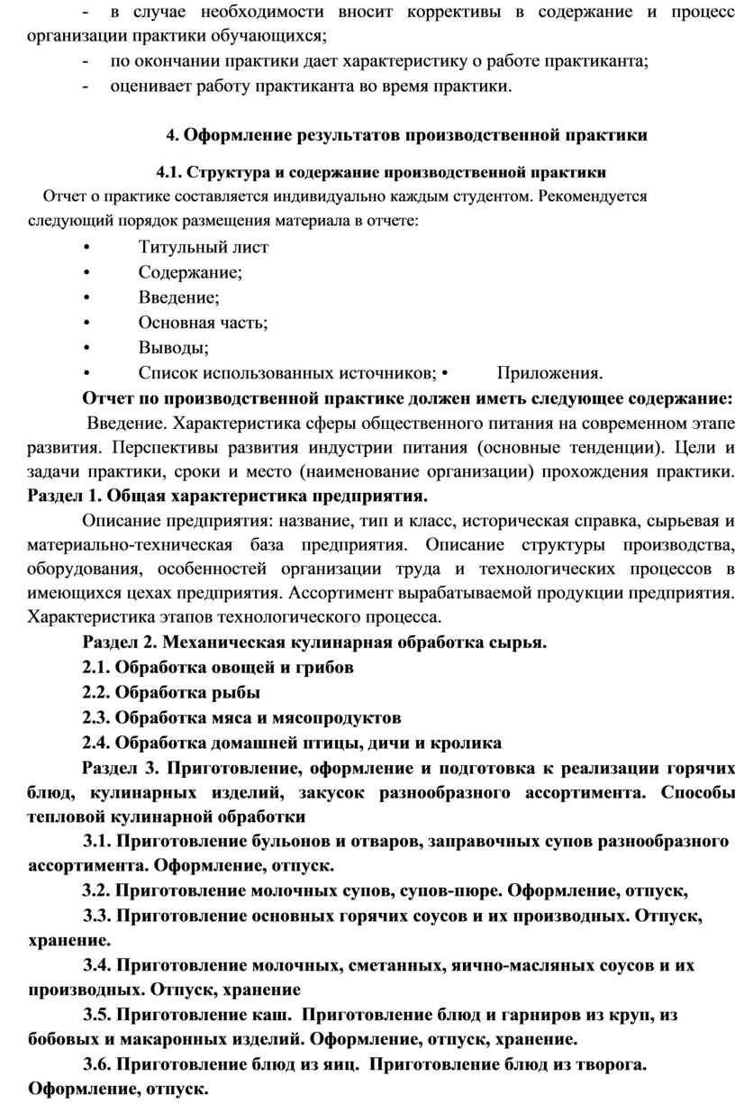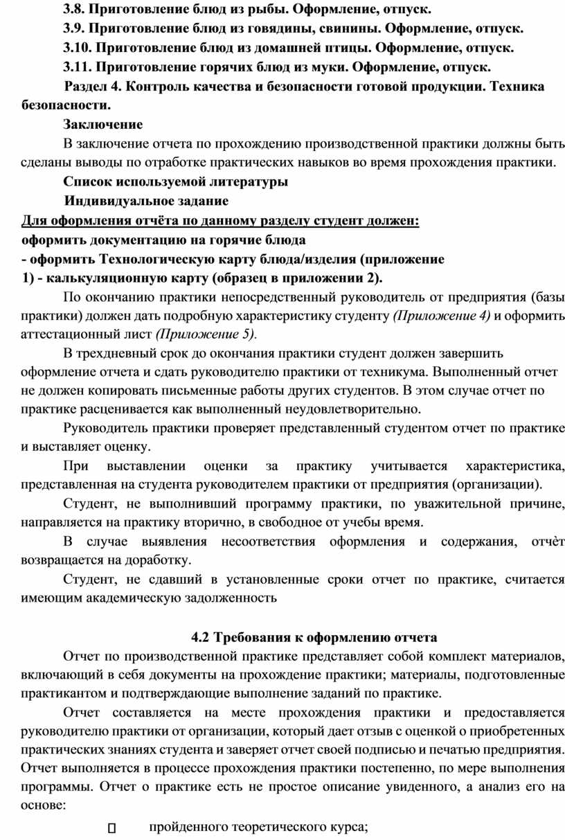 - осуществляется по результатам выполненного индивидуального задания и оформления дневника и отчета по практике (технологических карт и технологической схемы полуфабриката, а также приготовление данного полуфабриката);