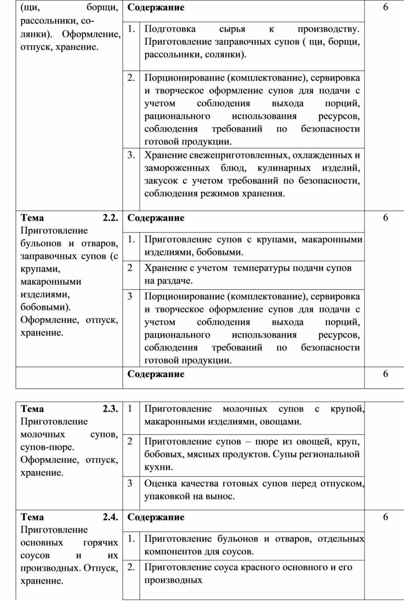 Тема 2.1. Приготовление бульонов и отваров, за-правочных супов (щи, борщи, рассольники, солянки). Оформление, отпуск, хранение. |