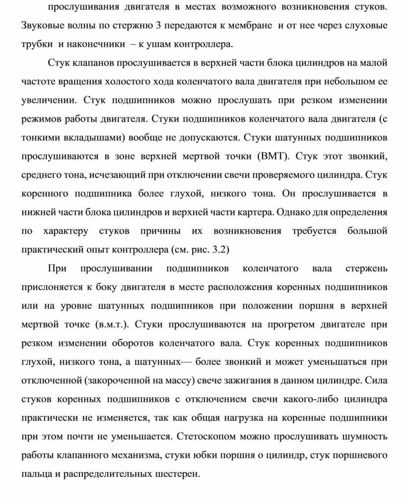 С помощью стетоскопов и при достаточных навыках можно уловить стуки при меньших зазорах. Усиление звука в стетоскопе происходит за счет колебаний мембраны или за счет специально встроенного транзисторного усилителя. Для улавливания шума и стука прикасаются слуховым стержнем к различным зонам прослушивания двигателя в местах возможного возникновения стуков. Звуковые волны по стержню 3 передаются к мембране и от нее через слуховые трубки и наконечники – к ушам контроллера.
