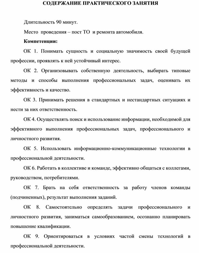 В ходе практических занятий обучающиеся закрепляют и углубляют теоретические знания и получают практические навыки по выполнению технологических операций, пользованию руководством по ТО и ремонту автомобилей и оформлению технологических документов. Приобретают новые сведения, необходимые для выполнения курсовой работы и в последующей практической деятельности.