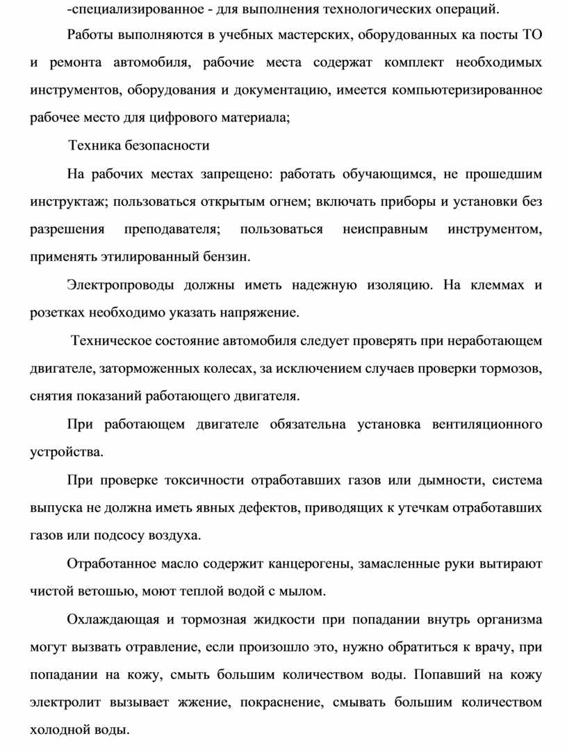 Работы выполняются в учебных мастерских, оборудованных ка посты ТО и ремонта автомобиля, рабочие места содержат комплект необходимых инструментов, оборудования и документацию, имеется компьютеризированное рабочее место для цифрового материала;