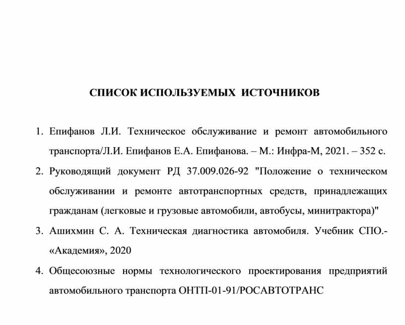 1. Епифанов Л.И. Техническое обслуживание и ремонт автомобильного транспорта/Л.И. Епифанов Е.А. Епифанова. – М.: Инфра-М, 2021. – 352 с.