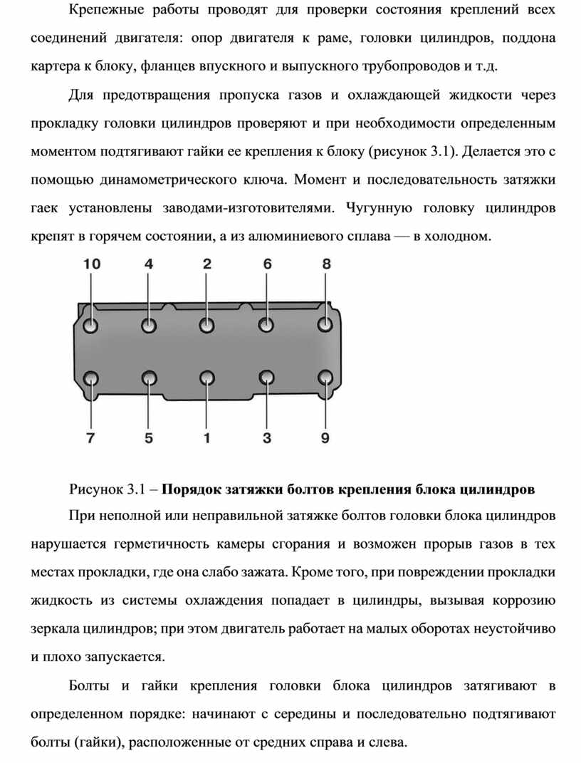 Для предотвращения пропуска газов и охлаждающей жидкости через прокладку головки цилиндров проверяют и при необходимости определенным моментом подтягивают гайки ее крепления к блоку (рисунок 3.1). Делается это с помощью динамометрического ключа. Момент и последовательность затяжки гаек установлены заводами-изготовителями. Чугунную головку цилиндров крепят в горячем состоянии, а из алюминиевого сплава — в холодном.