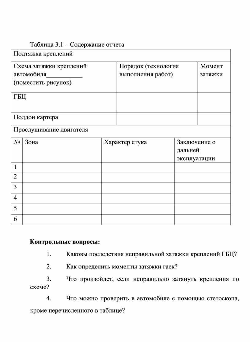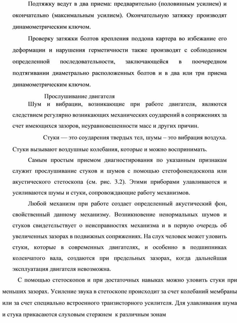 Оборудование: Автомобиль, стетоскоп, руководство по ТО и Р, методические указания к выполнению работ практического занятия, видеофрагмент, динамометрический ключ.