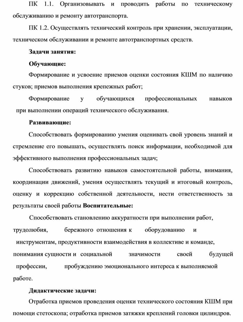 ПК 1.2. Осуществлять технический контроль при хранении, эксплуатации, техническом обслуживании и ремонте автотранспортных средств.