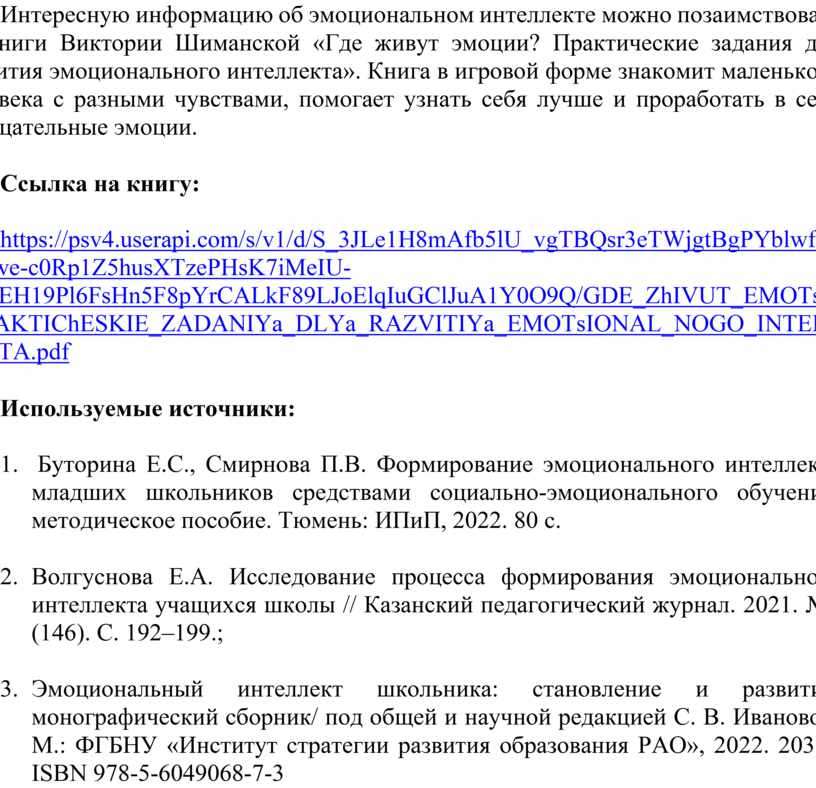 1. Буторина Е.С., Смирнова П.В. Формирование эмоционального интеллекта младших школьников средствами социально-эмоционального обучения: методическое пособие. Тюмень: ИПиП, 2022. 80 с.