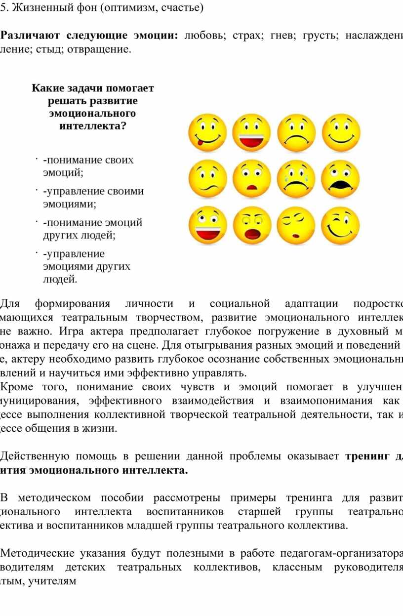 Для формирования личности и социальной адаптации подростков, занимающихся театральным творчеством, развитие эмоционального интеллекта крайне важно. Игра актера предполагает глубокое погружение в духовный мир персонажа и передачу его на сцене. Для отыгрывания разных эмоций и поведений на сцене, актеру необходимо развить глубокое осознание собственных эмоциональных проявлений и научиться ими эффективно управлять.