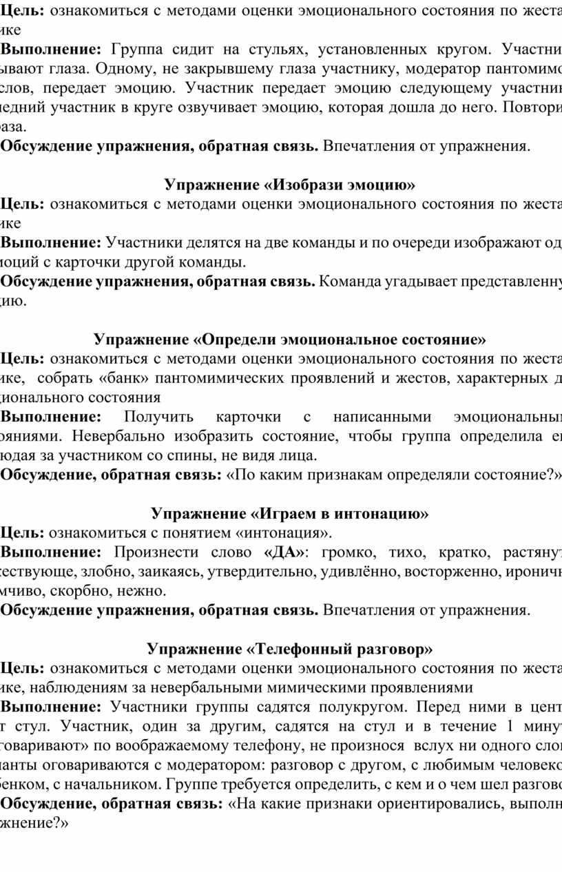 Выполнение: Получить карточки с написанными эмоциональными состояниями. Невербально изобразить состояние, чтобы группа определила его, наблюдая за участником со спины, не видя лица.