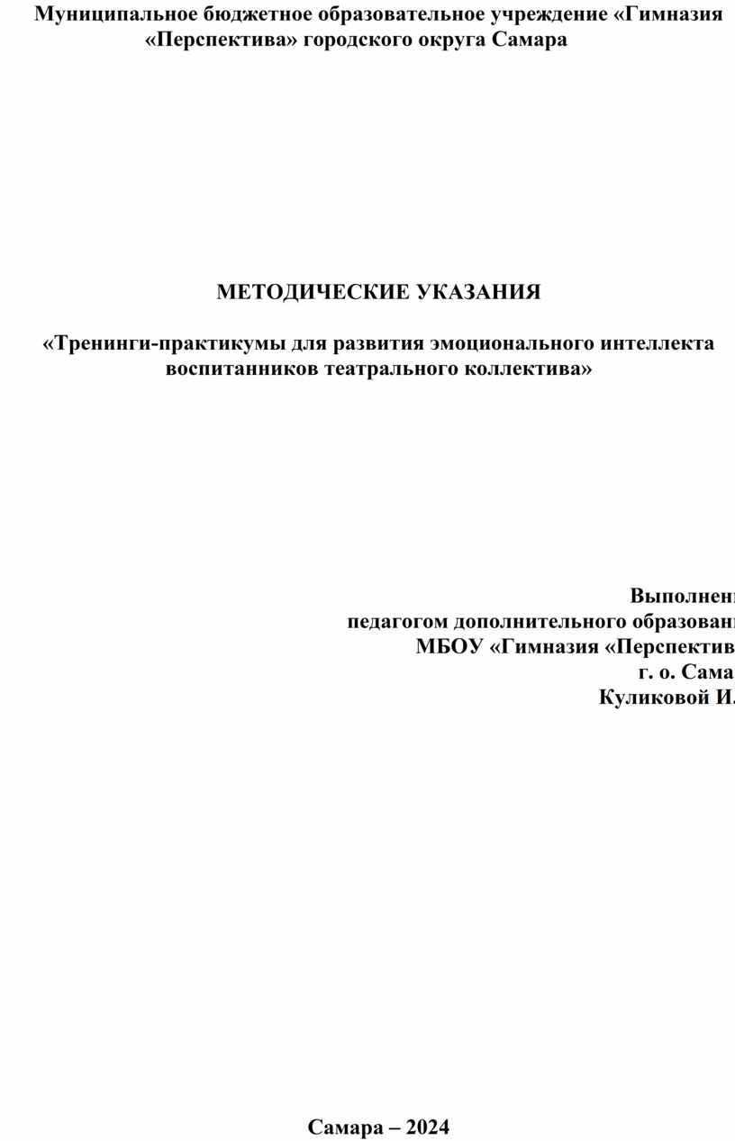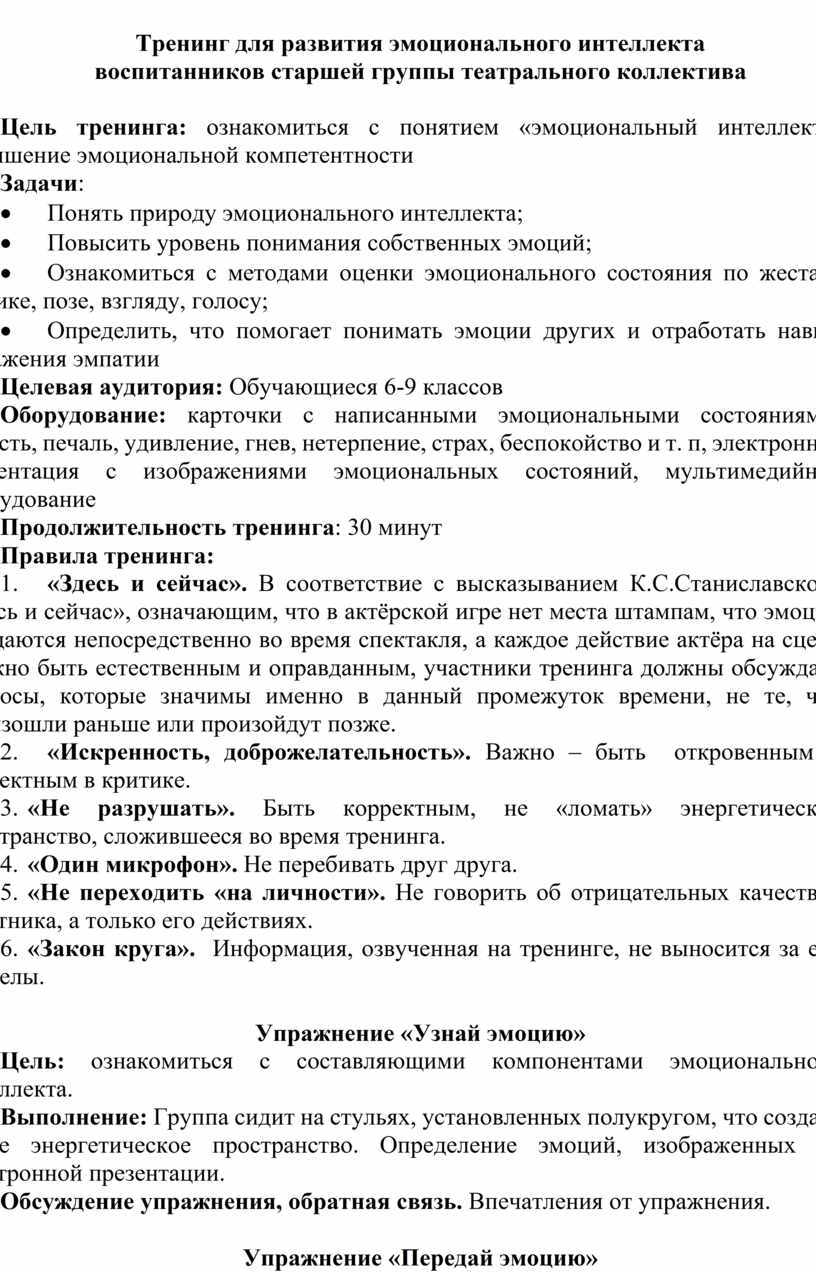 В методическом пособии рассмотрены примеры тренинга для развития эмоционального интеллекта воспитанников старшей группы театрального коллектива и воспитанников младшей группы театрального коллектива.