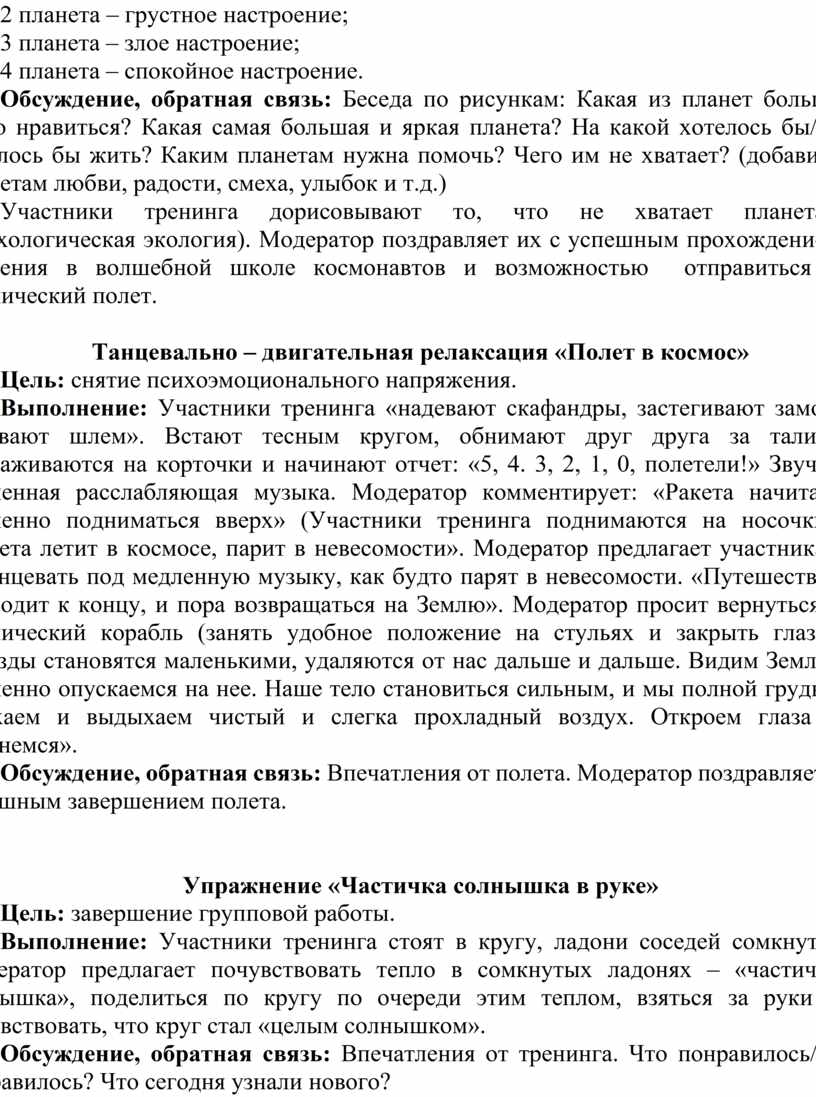 Выполнение: Участники тренинга «надевают скафандры, застегивают замок, надевают шлем». Встают тесным кругом, обнимают друг друга за талию, присаживаются на корточки и начинают отчет: «5, 4. 3, 2, 1, 0, полетели!» Звучит медленная расслабляющая музыка. Модератор комментирует: «Ракета начитает медленно подниматься вверх» (Участники тренинга поднимаются на носочки). «Ракета летит в космосе, парит в невесомости». Модератор предлагает участникам потанцевать под медленную музыку, как будто парят в невесомости. «Путешествие подходит к концу, и пора возвращаться на Землю». Модератор просит вернуться в космический корабль (занять удобное положение на стульях и закрыть глаза). «Звезды становятся маленькими, удаляются от нас дальше и дальше. Видим Землю, медленно опускаемся на нее. Наше тело становиться сильным, и мы полной грудью вдыхаем и выдыхаем чистый и слегка прохладный воздух. Откроем глаза и потянемся».