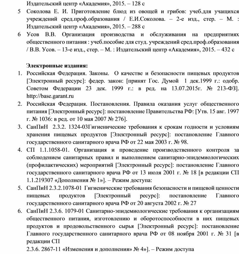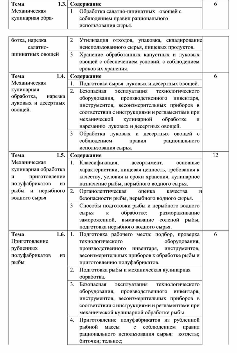Знать: - требования охраны труда, пожарной безопасности, производственной санитарии и личной гигиены в организациях питания; - виды, назначение, правила безопасной эксплуатации технологического оборудования и правила ухода за ним; - требования к качеству, условиям и срокам хранения овощей, грибов, рыбы, нерыбного водного сырья, птицы, дичи, полуфабрикатов из них; - рецептуры, методы обработки сырья, приготовления полуфабрикатов; - способы сокращения потерь при обработке сырья и приготовлении полуфабрикатов. |