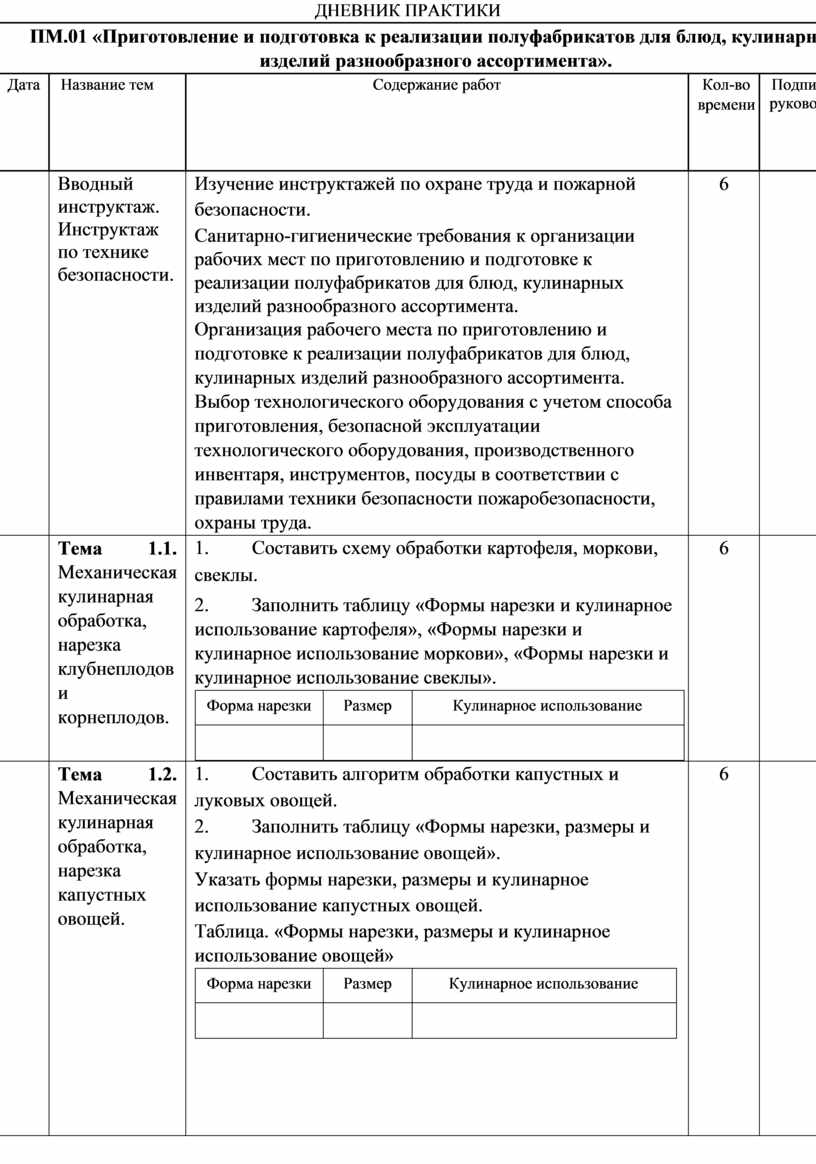ОТЧЕТ по учебной практике УП.01.01. Приготовление и подготовка к реализации полуфабрикатов для блюд, кулинарных изделий разнообразного ассортимента