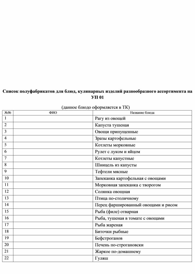 Список полуфабрикатов для блюд, кулинарных изделий разнообразного ассортимента на УП 01