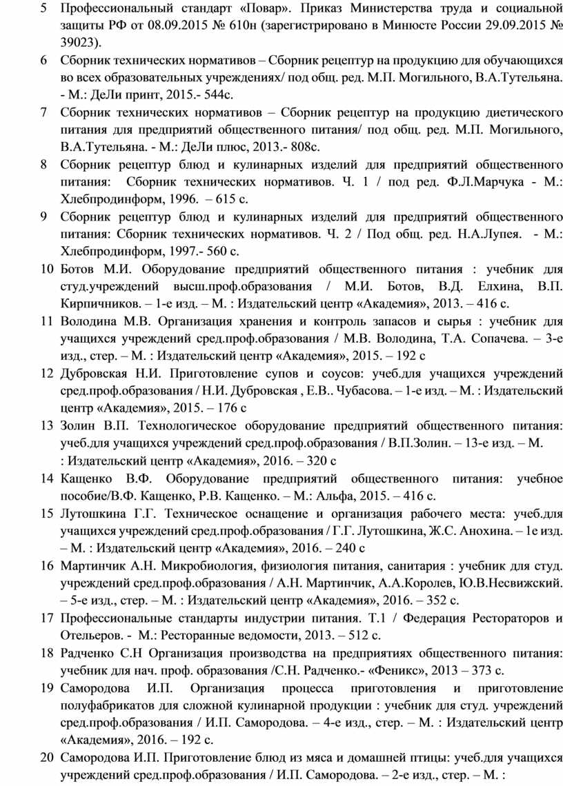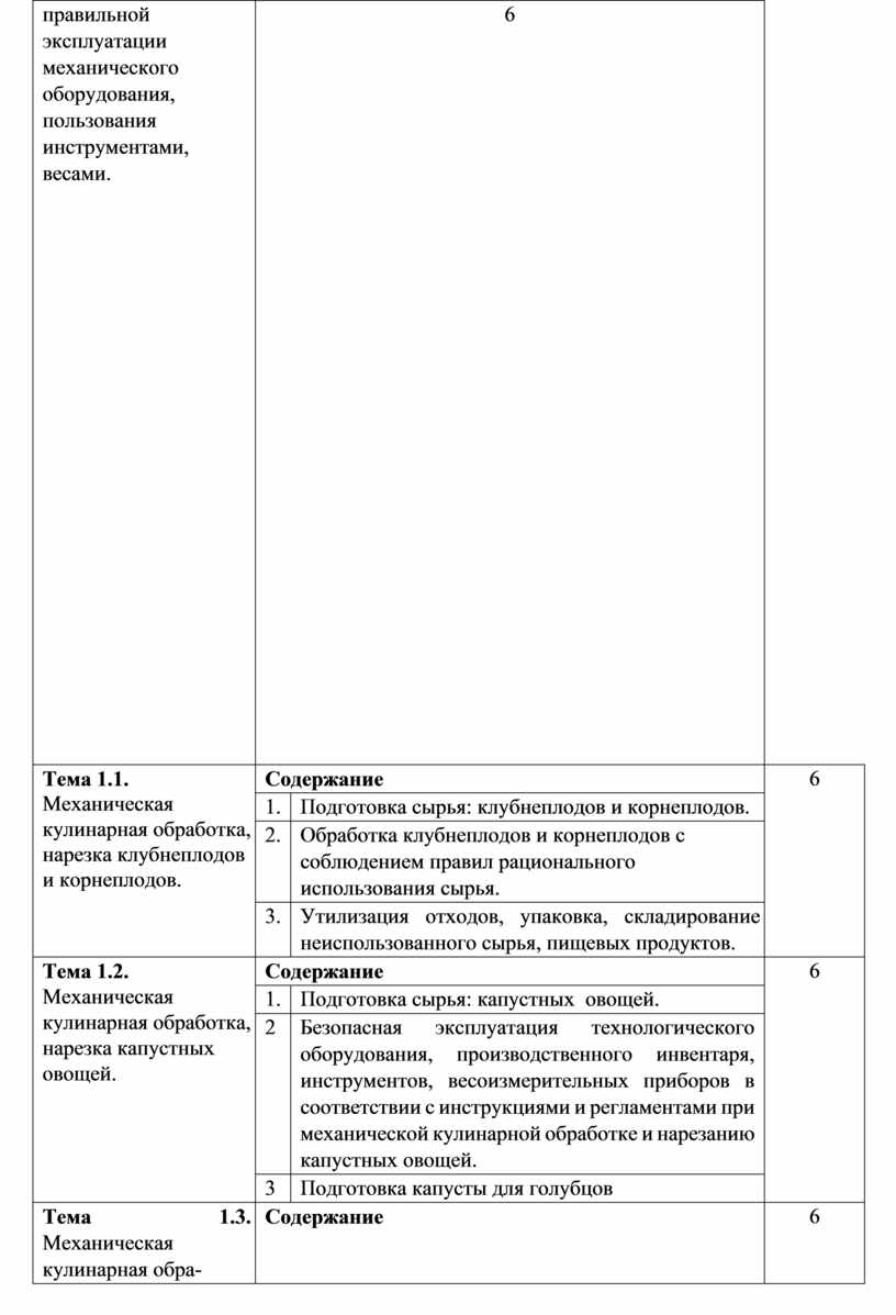 Должен уметь: - подготавливать рабочее место, выбирать, безопасно эксплуатировать оборудование, производственный инвентарь, инструменты, весоизмерительные приборы в соответствии с инструкциями и регламентами; - соблюдать правила сочетаемости, взаимозаменяемости, рационального использования сырья и продуктов, подготовки и применения пряностей и приправ; - выбирать, применять, комбинировать методы обработки сырья, приготовления полуфабрикатов, обеспечивать условия, соблюдать сроки их хранения. |