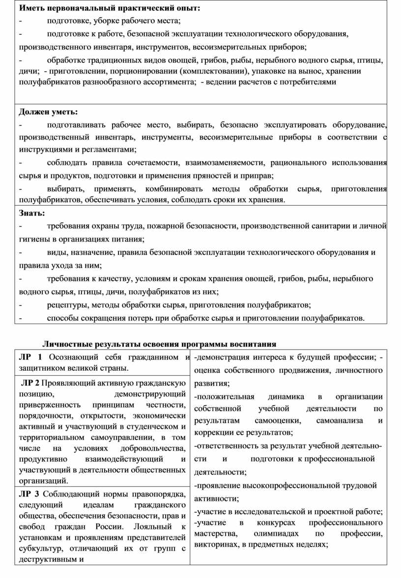 Иметь первоначальный практический опыт: - подготовке, уборке рабочего места; - подготовке к работе, безопасной эксплуатации технологического оборудования, производственного инвентаря, инструментов, весоизмерительных приборов; - обработке традиционных видов овощей, грибов, рыбы, нерыбного водного сырья, птицы, дичи; - приготовлении, порционировании (комплектовании), упаковке на вынос, хранении полуфабрикатов разнообразного ассортимента; - ведении расчетов с потребителями |