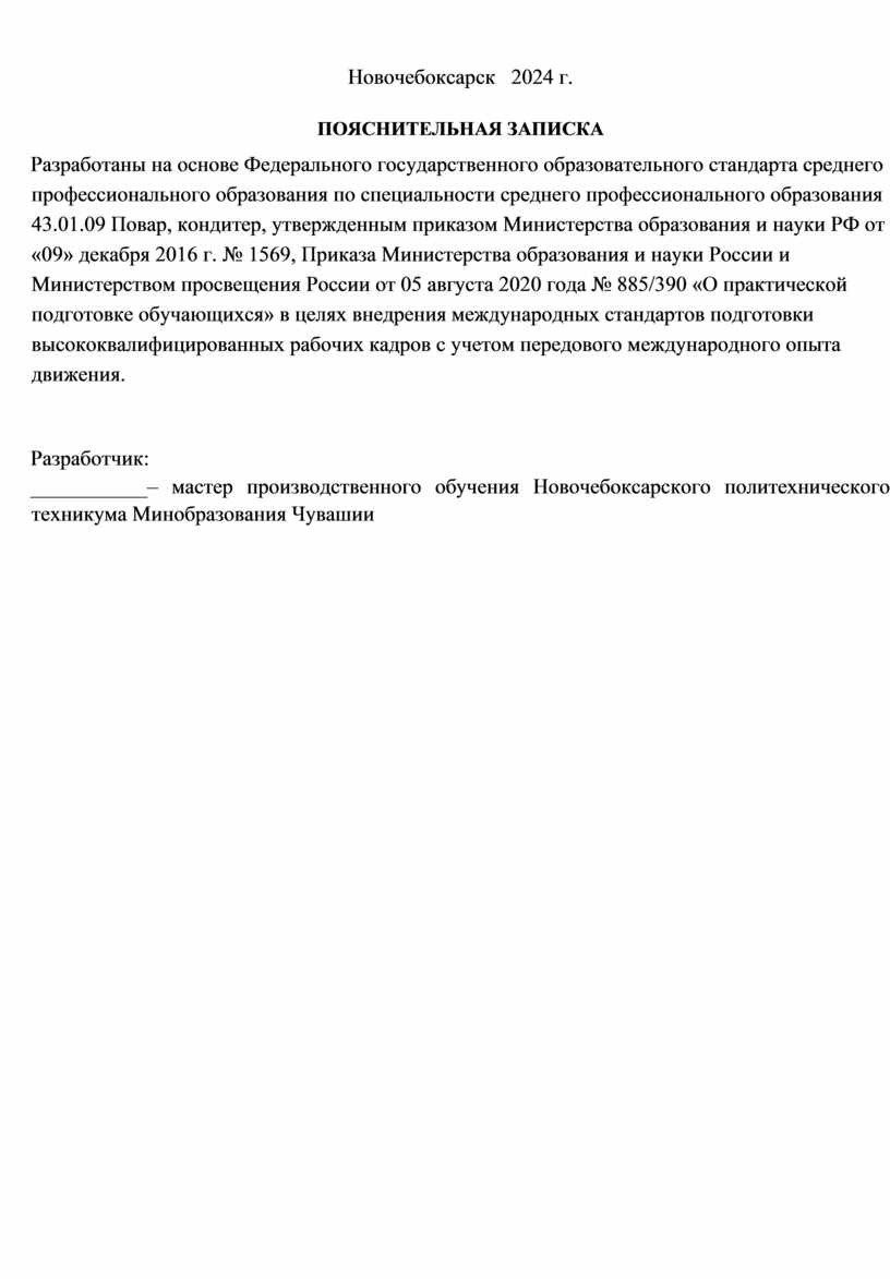 Разработаны на основе Федерального государственного образовательного стандарта среднего профессионального образования по специальности среднего профессионального образования 43.01.09 Повар, кондитер, утвержденным приказом Министерства образования и науки РФ от «09» декабря 2016 г. № 1569, Приказа Министерства образования и науки России и Министерством просвещения России от 05 августа 2020 года № 885/390 «О практической подготовке обучающихся» в целях внедрения международных стандартов подготовки высококвалифицированных рабочих кадров с учетом передового международного опыта движения.