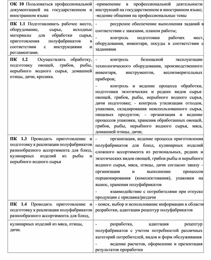 ПК 1.1 Подготавливать рабочее место, оборудование, сырье, исходные материалы для обработки сырья, приготовления полуфабрикатов в соответствии с инструкциями и регламентами. |