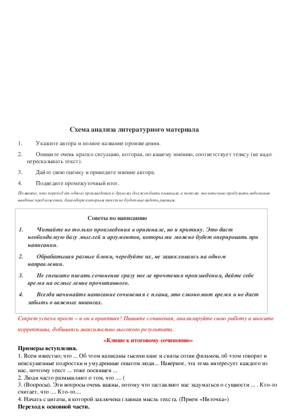 Представленные материалы содержат необходимые материалы для подготовки к итоговому сочинению. Раскрыты все необходимые требования и критерии, дан соответствующий комментарий по всем направлениям. Собран банк аргументов, даны примерные темы сочинений, цитаты, афоризмы. Представлены примерные планы сочинений, схемы написания, описана структура описания. Приведены примеры сочинений.
